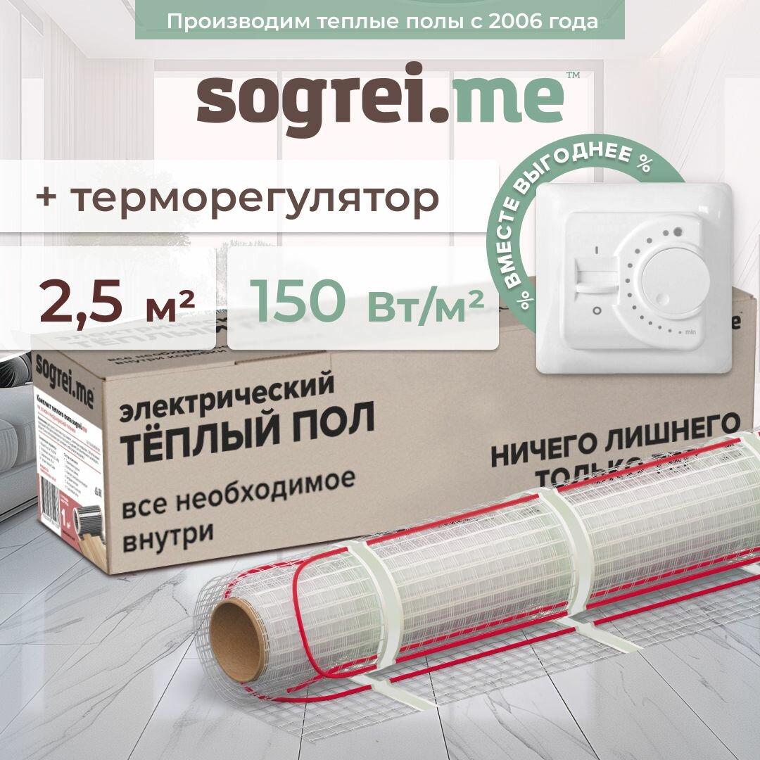 Теплый пол электрический под плитку UHK-M 150-0,5-0,5м2 терморегулятор SM160 3,5 кВт. Греющий кабель для теплого пола. Нагревательный мат