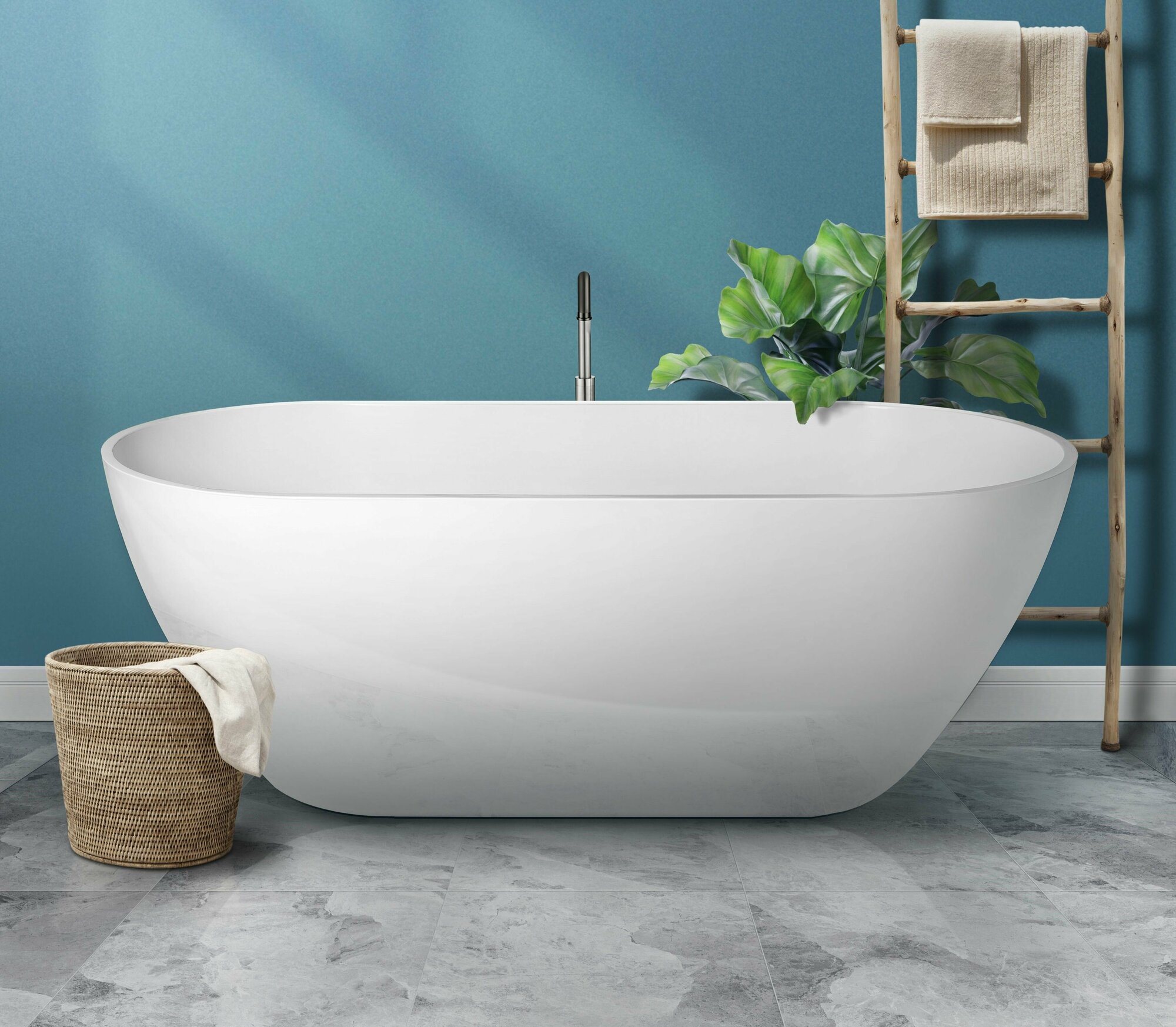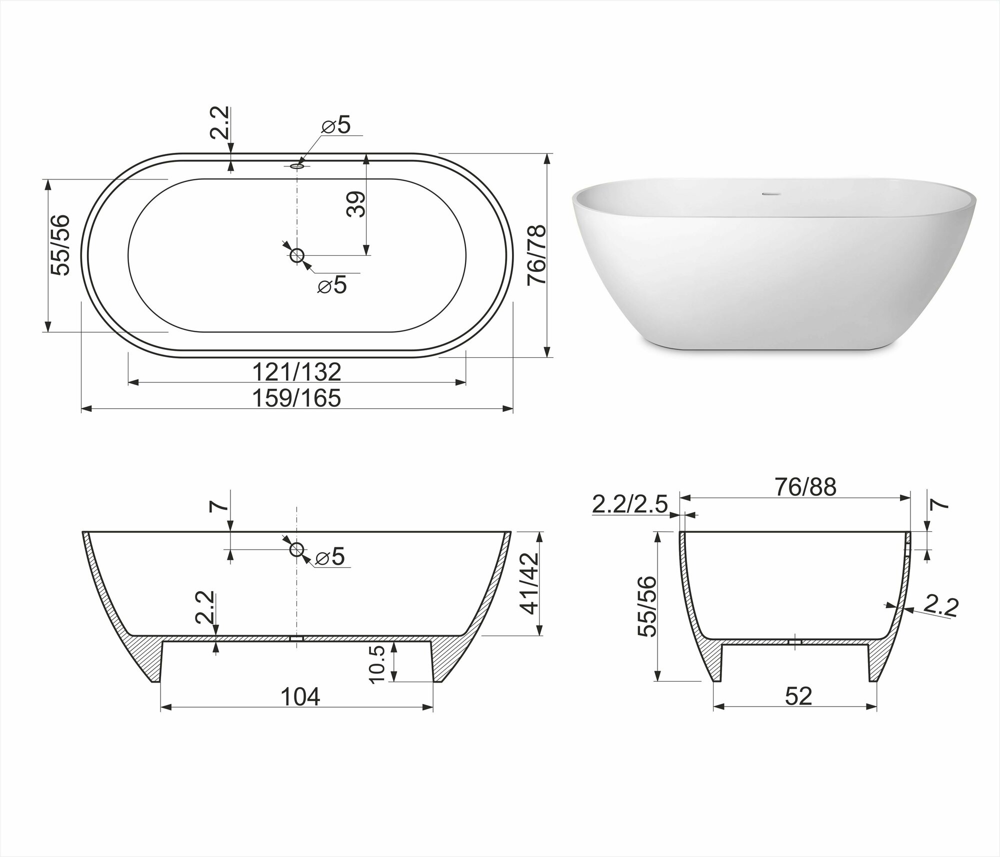 Ванна отдельностоящая из литьевого мрамора Майотта 165х78 с системой скрытого слива-перелива, матовый белый