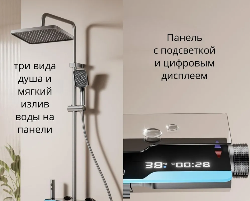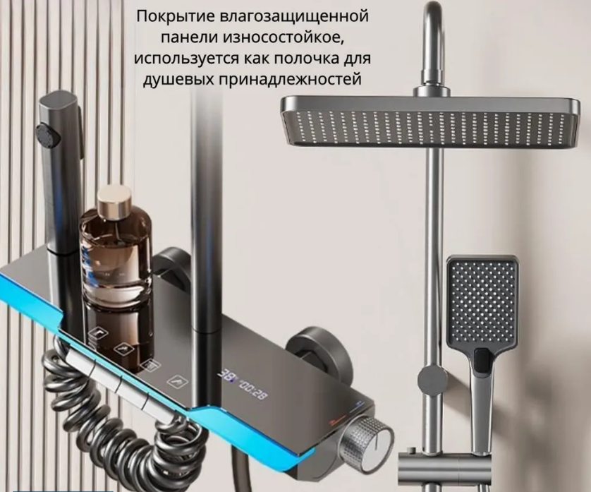 Душевой комплект для ванны и душевой кабины с подсветкой, цифровым дисплеем, (душевая система 4 в 1), серый