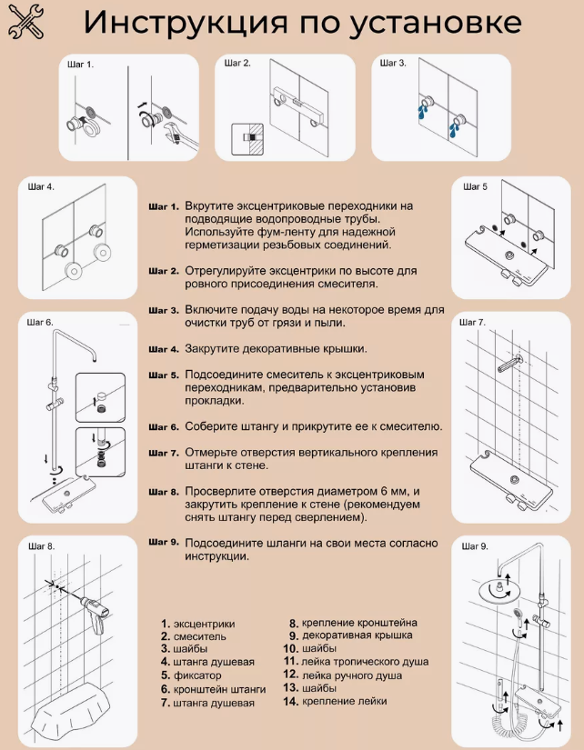 | Комплектация | вентиль / верхний душ / гигиенический душ / держатель лейки / душевая штанга / кронштейн для верхнего душа / лейка / переключатель потоков / Смеситель / шланг |