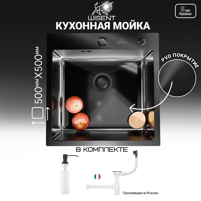 Мойка для кухни нержавеющая сталь с PVD покрытием (50х50см) Комплект с дозатором WISENT WGS35050B интересное:
