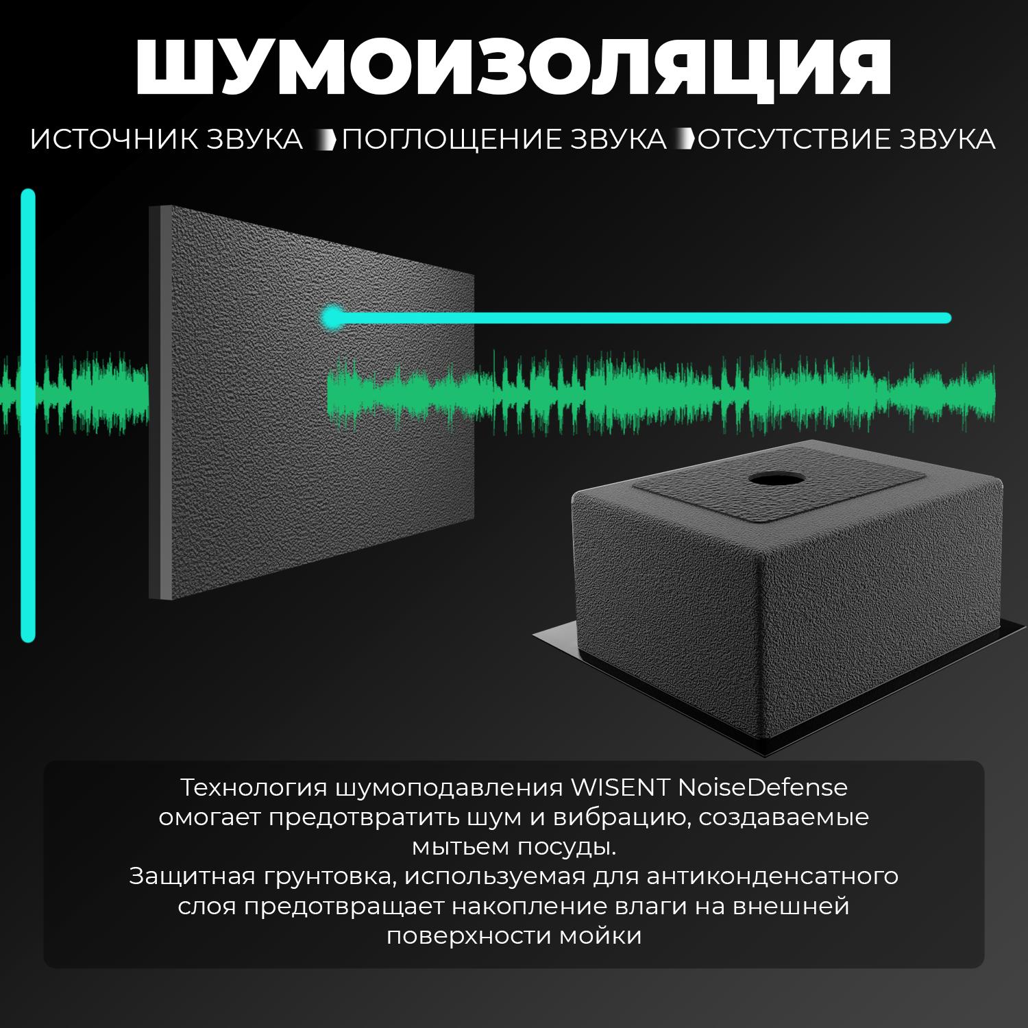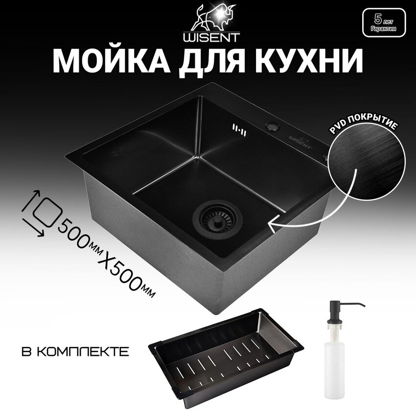 Комплект кухонная мойка из нержавеющей стали WISENT WX 5050B с PVD покрытием (50х50см) с металлическим коландером и дозатором. интересное: