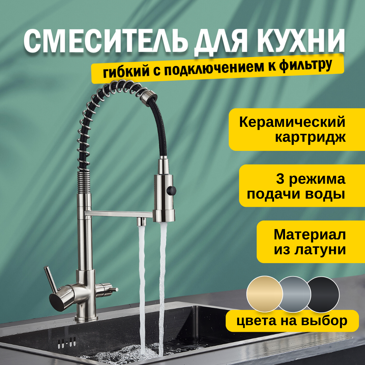 Смеситель кран для кухни с фильтром для питьевой воды, с гибким изливом, кухонный серебристый, латунь