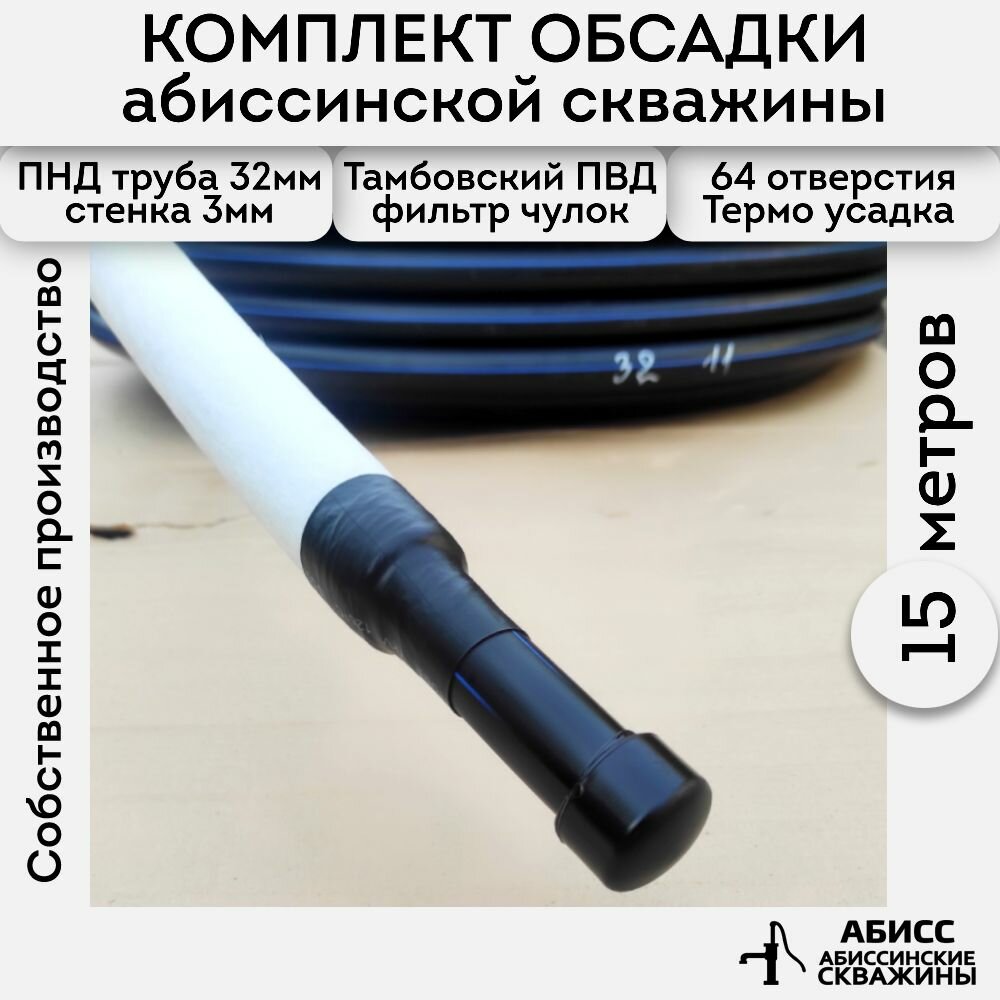 | Подробная комплектация | Комплект обсадки 15 метров. для абиссинской скважины выполненной гидробурением - фильтр ПВД (чулок) смонтирован на перфорированную трубу ПНД 32мм -1шт. |