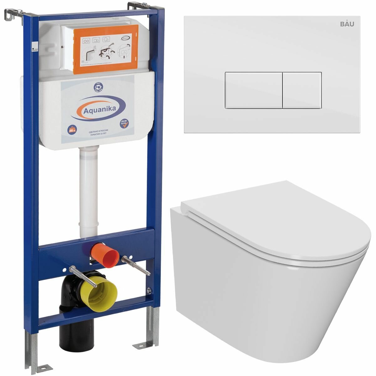 Купить Комплект BAU 6 в 1: инсталляция BAU Aquanika, унитаз безободковый торнадо обратного потока Bau Nimb Hurricane-2, сиденье микролифт, белая клавиша