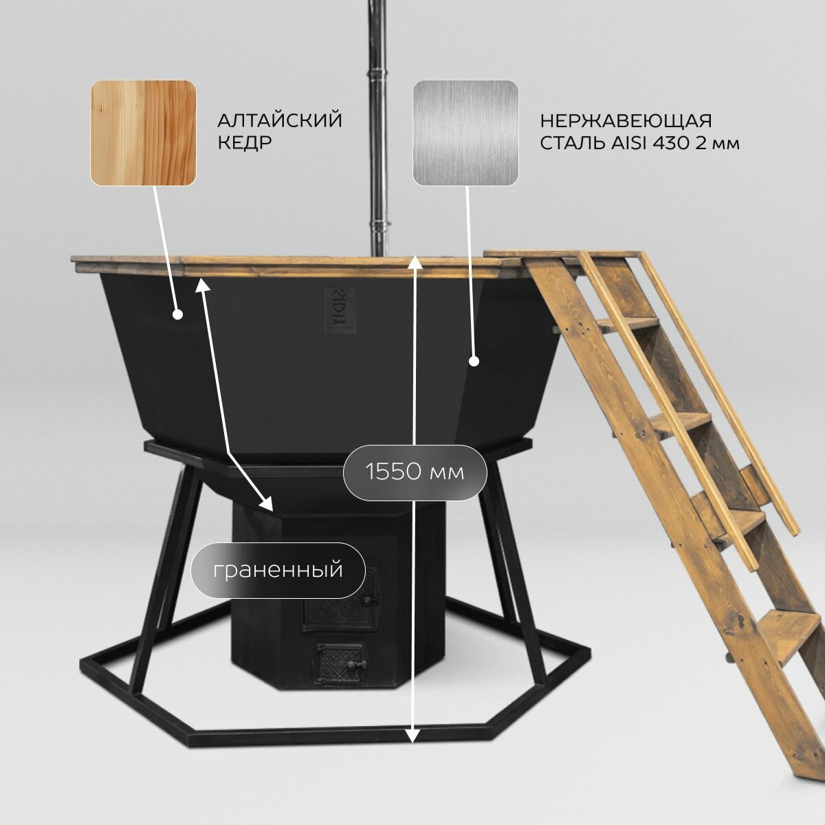 | Подробная комплектация | Чаша из нержавеющей стали AISI 430 толщиной 2 мм - 1 шт., Лестница из алтайского дерева - 1 шт., Опора из черного металла- 1 шт., Печь из черного металла - 1 шт., Дымоход - 1 шт. |