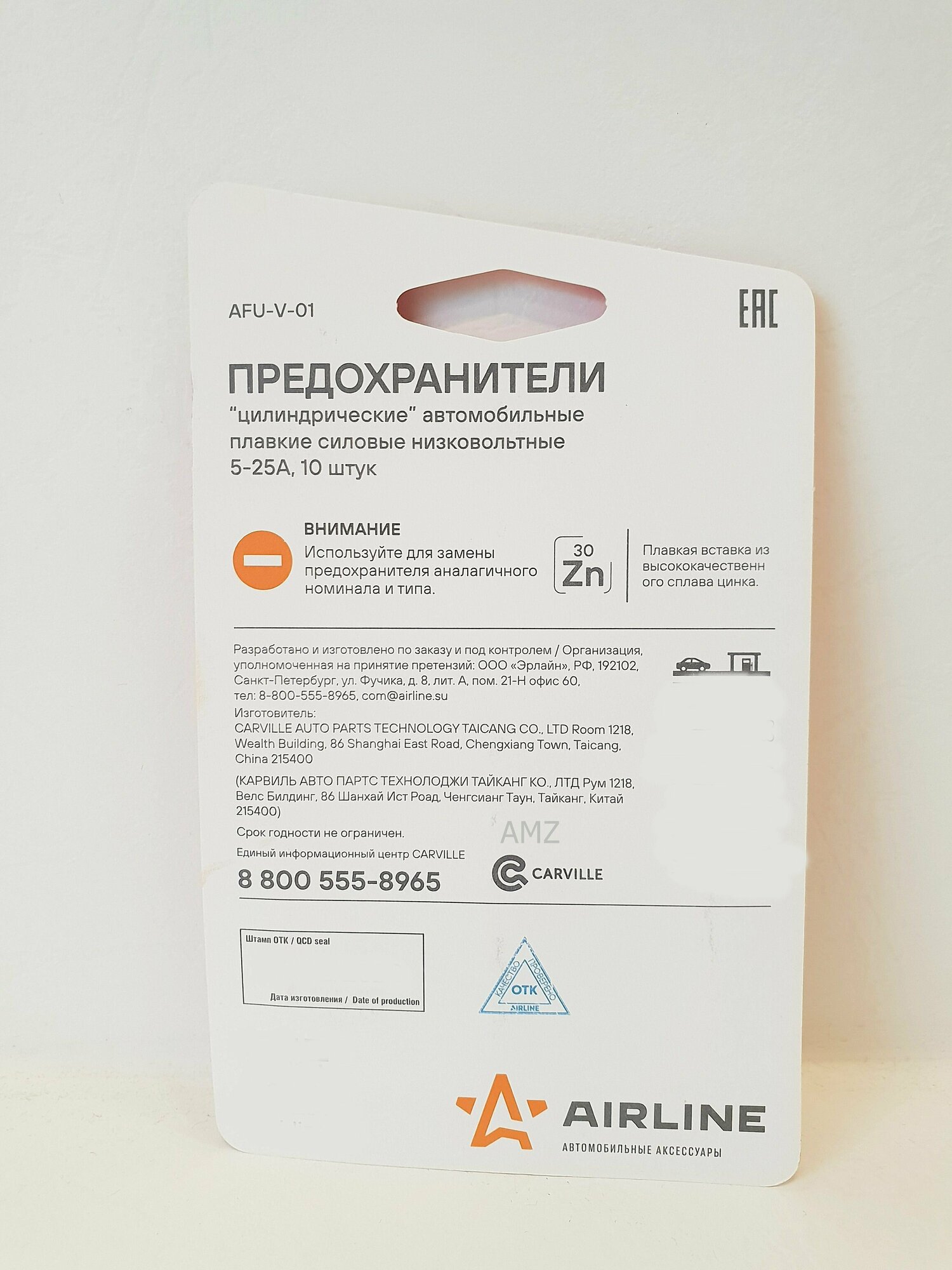 Купить Предохранители Цилиндрические В Блистере (10 Шт. 5-25А) (Afu-V-01) AIRLINE арт. AFUV01