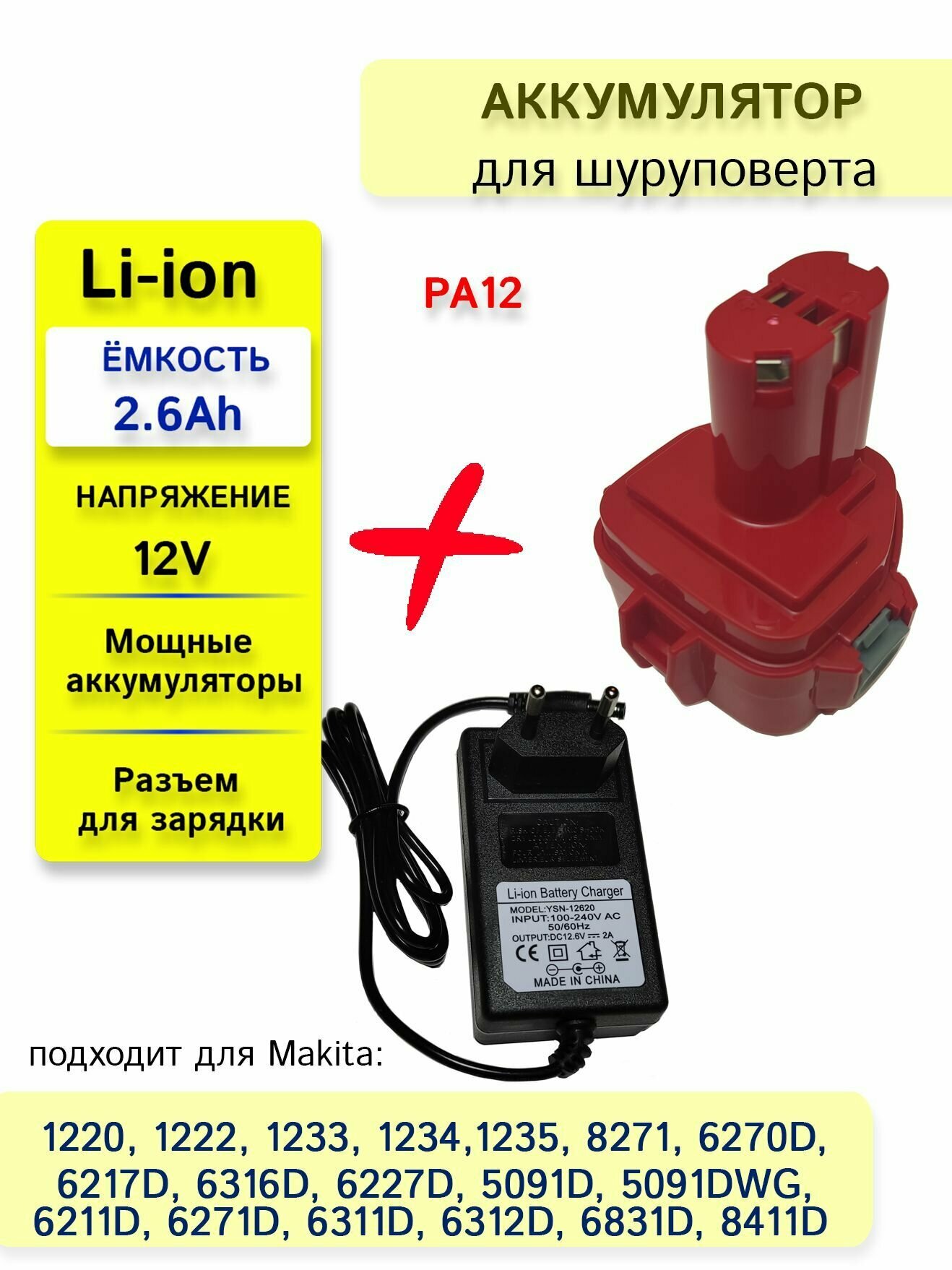 Купить Аккумулятор PA12 для Makita 12V 2.6Ah Li-Ion (1220, 1222, 1233, 1234, 1235, 62171, 8271, 6270D) + зарядное устройство