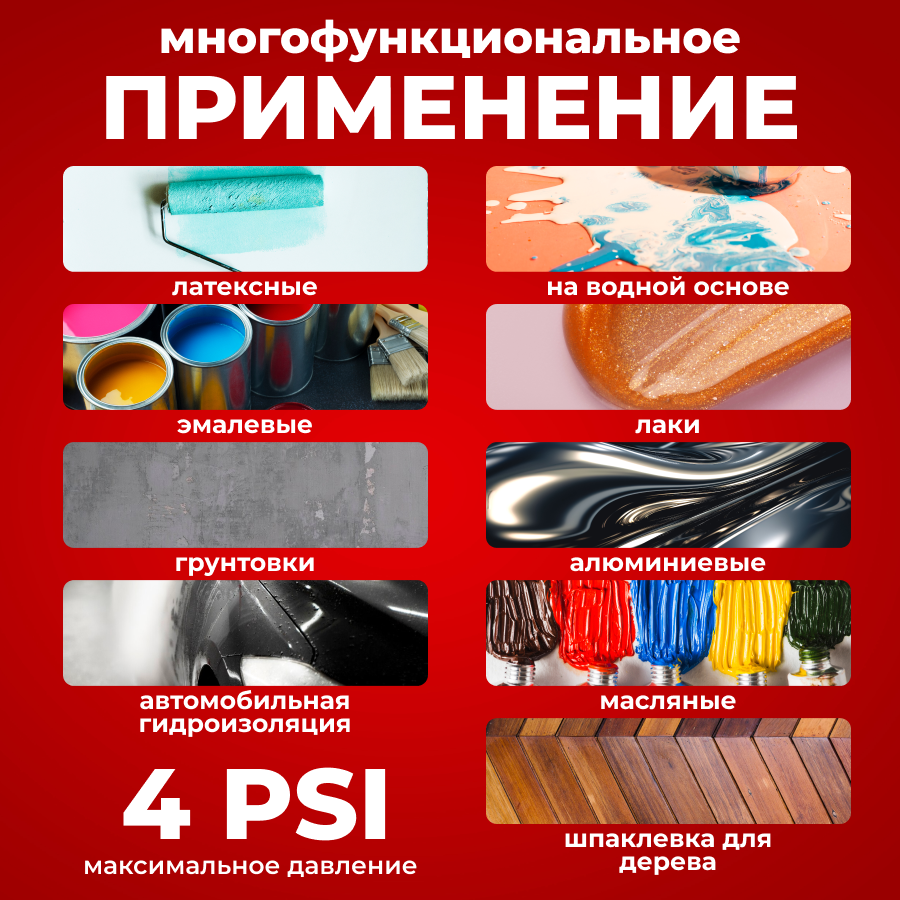 | Распыляемый материал | грунтовка / краска / лак / масло / протрава масляная / шпатлевка / эмаль |
