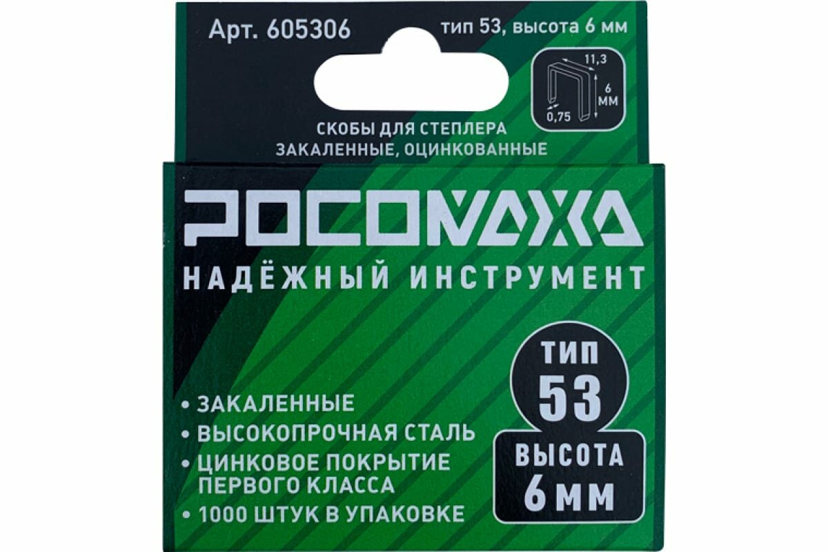 Росомаха Скобы для степлера закаленные, оцинкованные (тип 53, 1000 шт./уп.), высота 8 мм 605308