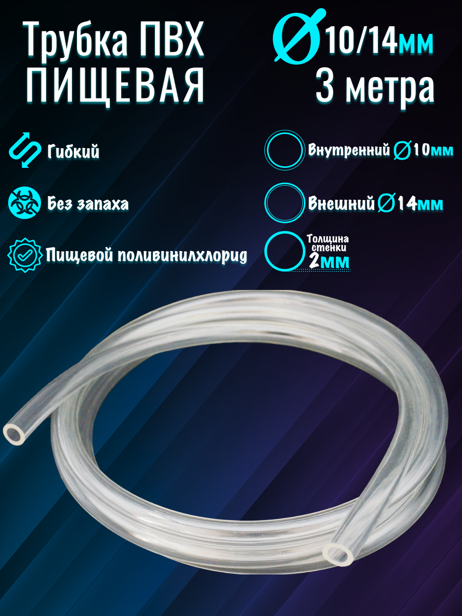 | Дополнительная информация | Материал: пищевой ПВХ; Внутренний диаметр: 10мм; Внешний диаметр: 14мм; Толщина стенки: 2мм |