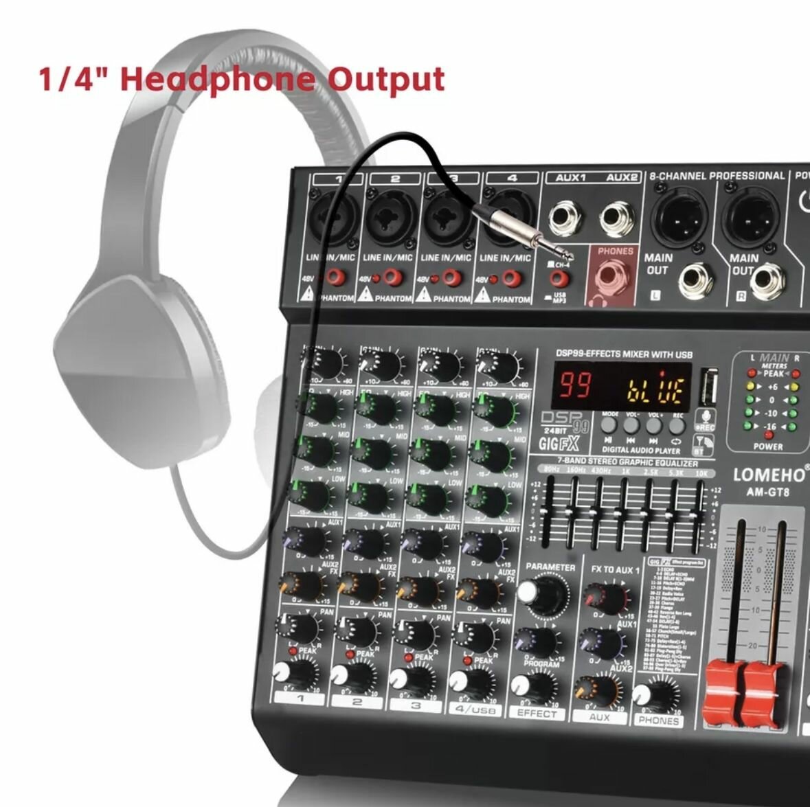 8-канальный микшерный пульт с 99 цифровыми эффектами, Bluetooth, USB-воспроизведением и записью, а также 2 AUX-выходами. интересное: