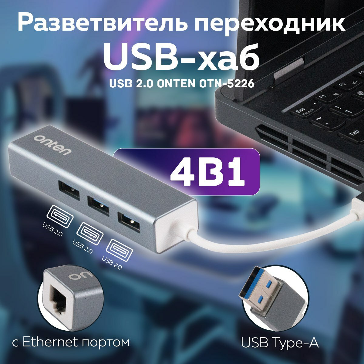 Компактный USB-хаб Onten OTN-5226 (4-в-1) с Ethernet адаптером и 3 портами USB 2.0 интересное: