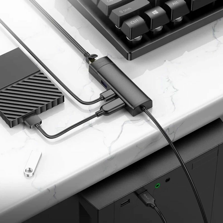 USB Хаб (HB42) с 1 USB на 3 USB 3.0+RJ45, HOCO, L=1.2M, черный