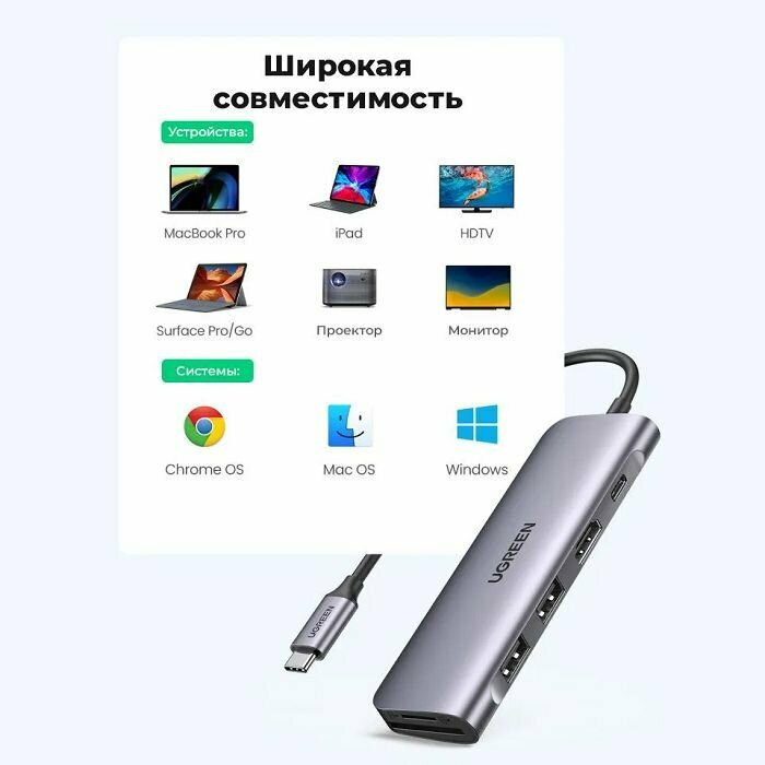 Док-станция UGREEN CM195 (15214) USB-C To HDMI+2*USB 3.0 A+ USB-C+SD/TF+PD Converter. Цвет: серый космос.
