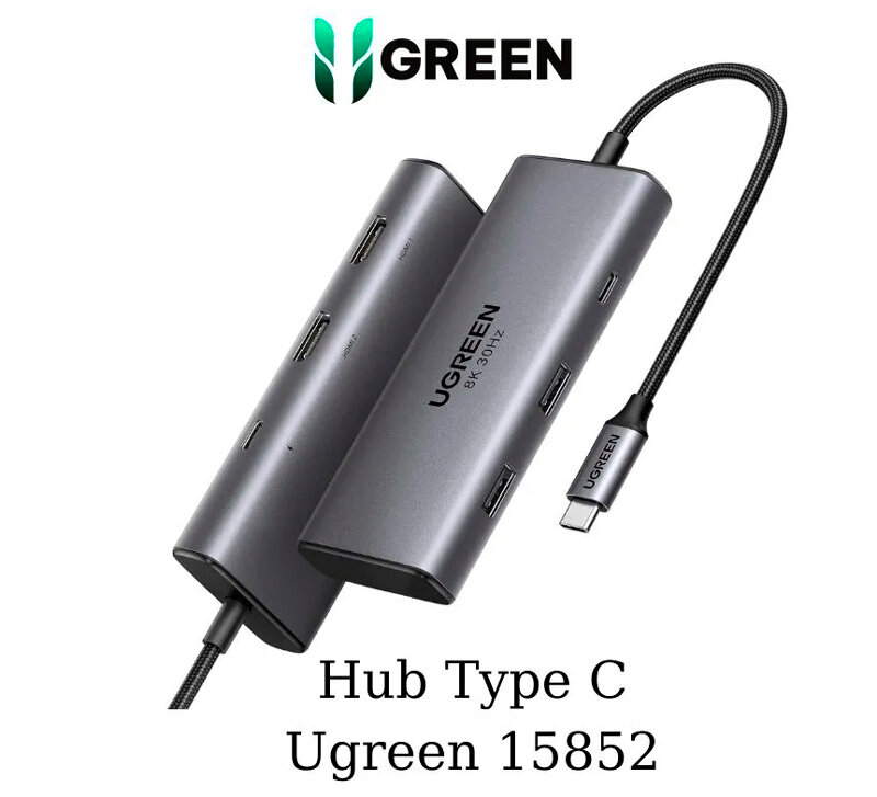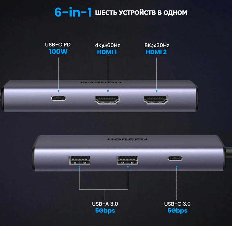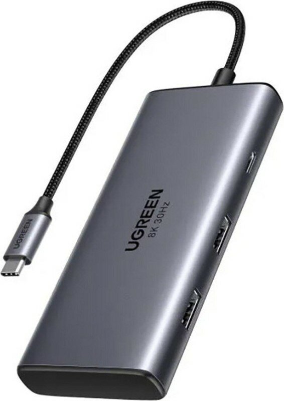 Хаб (разветвитель) Ugreen Revodok 6-in-1 8K@30Hz USB-C to 2*USB-A 3.0&USB-C 3.0&2*HDMI&PD, (15852), серый