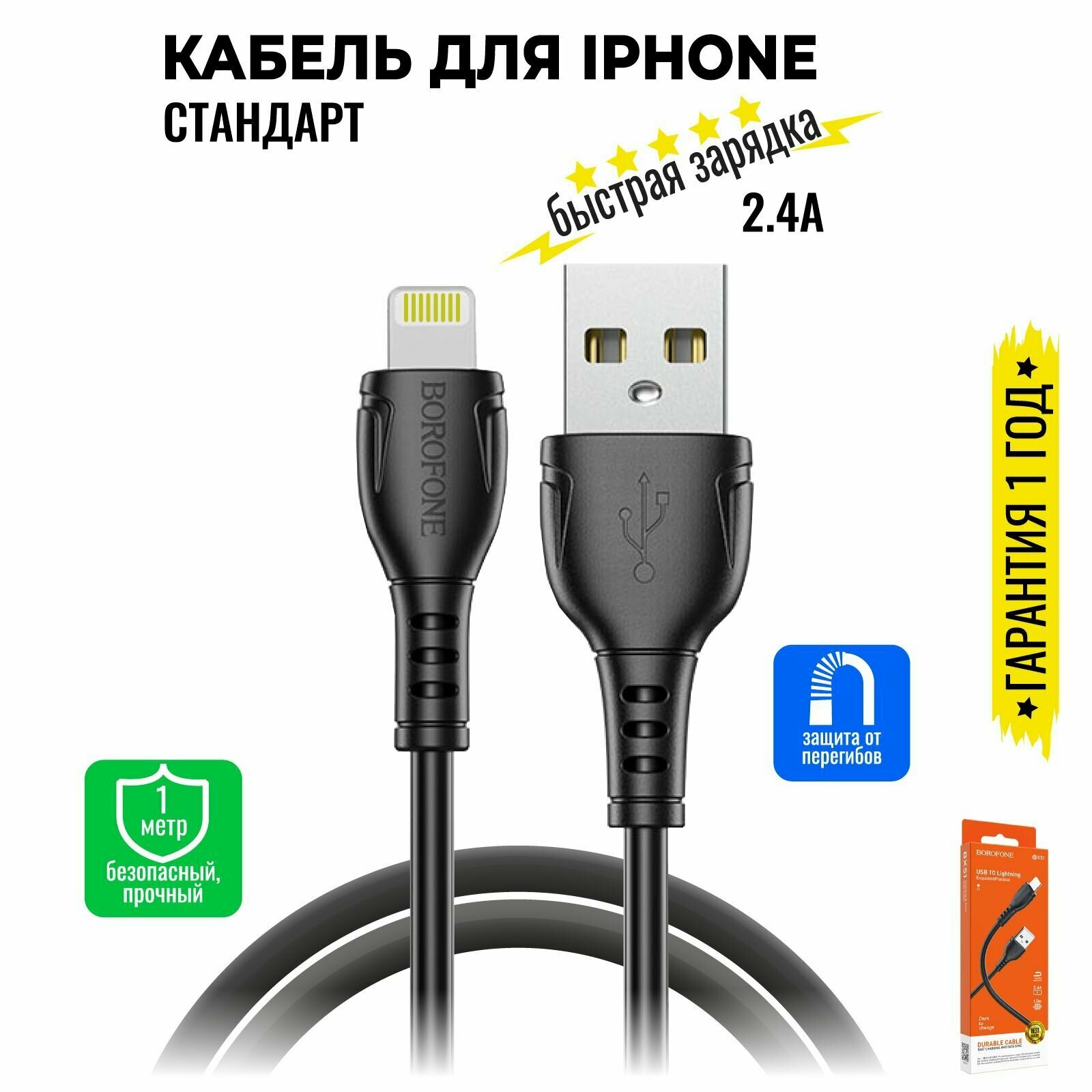 USB - кабель Lightning Borofone BX51 / Кабель для зарядки и передачи данных / Провод для iPhone (черный)