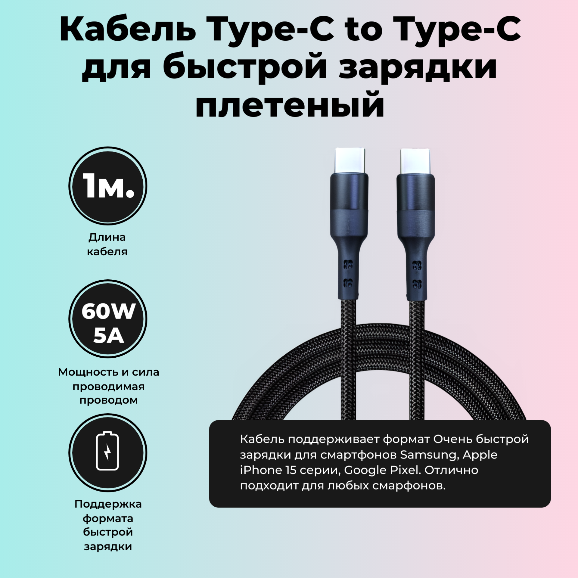 Кабель плетеный Type C 60W 5A прочный в оплетке 1м черный интересное: