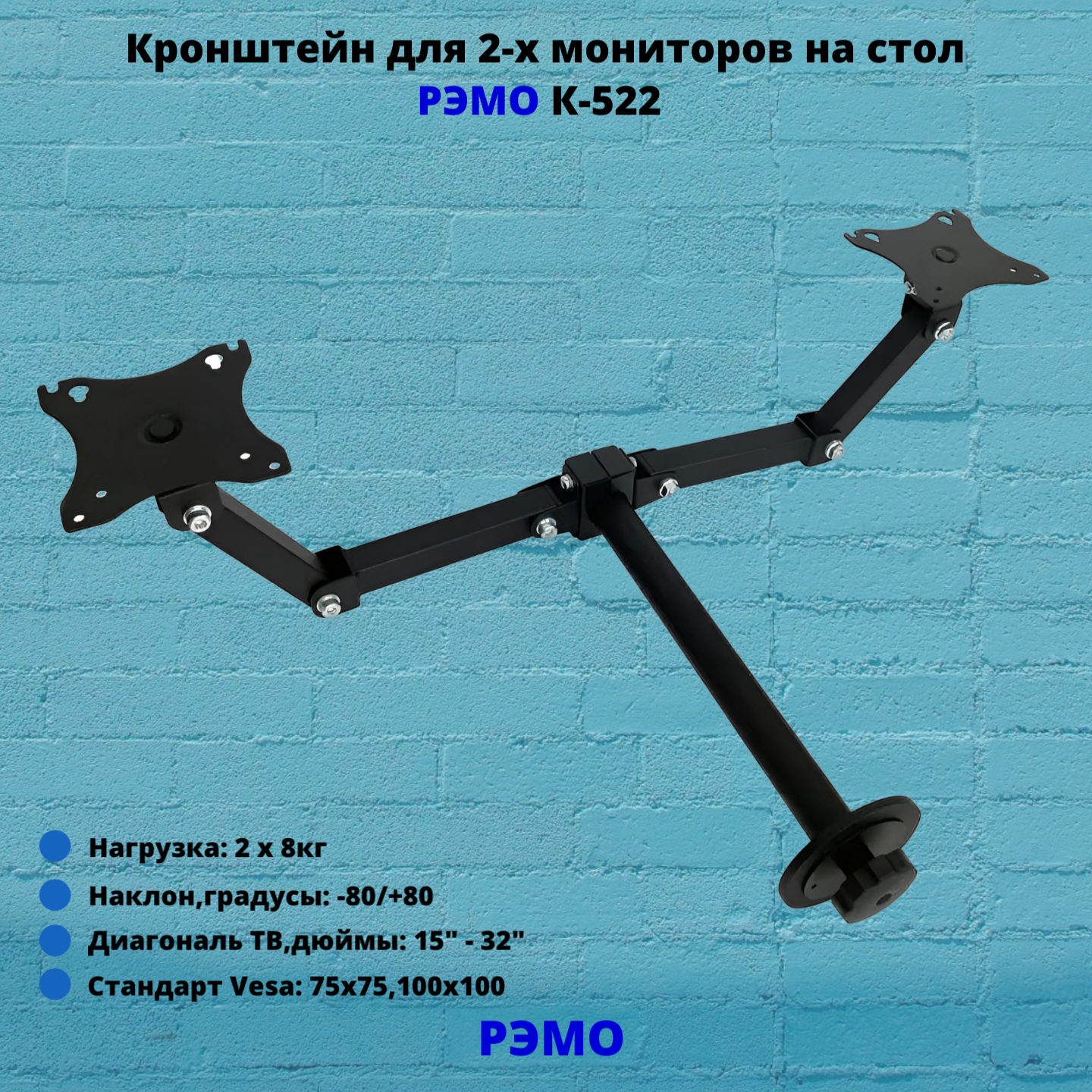 Кронштейн РЭМО Для 2 мониторов, К-522, настольный, наклонно-поворотный черный (К-522) интересное: