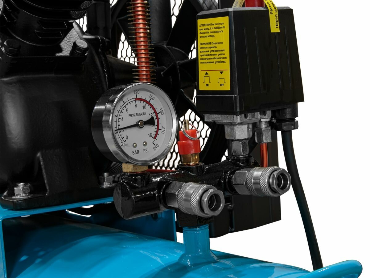 Мощный трехцилиндровый двигатель. Быстрый запуск и заполнение ресивера. Большой объем ресивера (50 л.) обеспечивает ровную и долгую подачу воздуха.