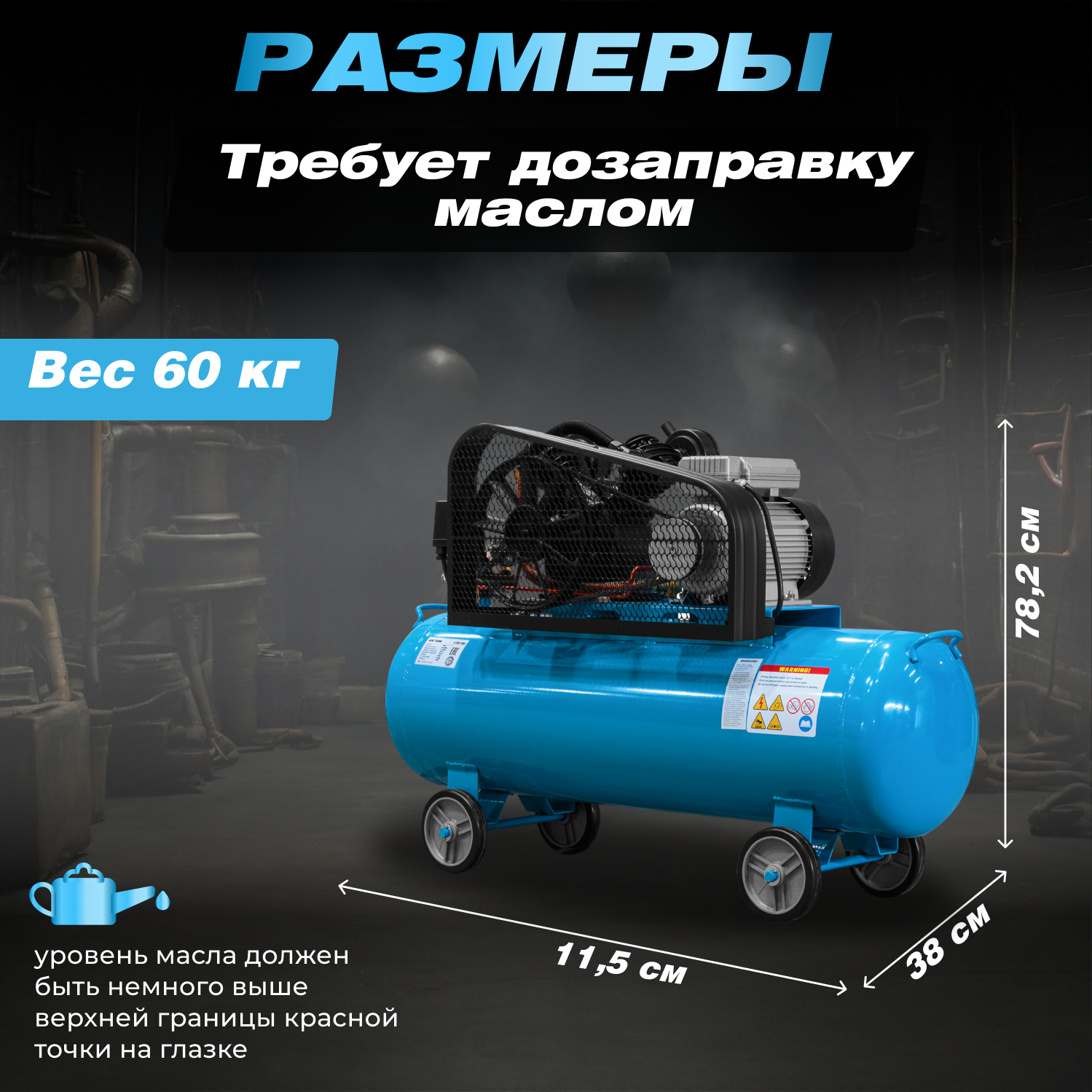 уровень масла должен быть немного выше верхней границы красной точки на глазке; уровень вибрации 3,1±1 м/с2; комплектация: компрессор, фильтр воздушный (2 шт), колесо транспортировочное (2 шт), опорная ножка (2 шт), комплект крепежа, ёмкость с маслом, сапун