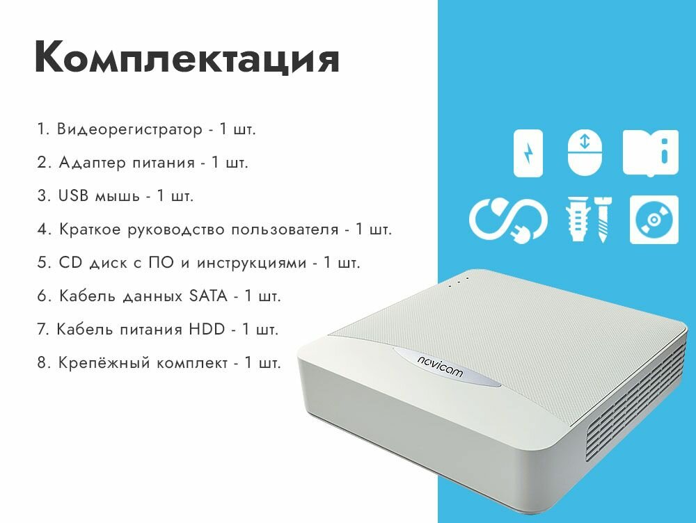 | Комплектация | видеорегистратор - 1 шт, адаптер питания - 1 шт, USB мышь - 1 шт, краткое руководство пользователя - 1 шт, CD диск с ПО и инструкциями - 1 шт, кабель данных SATA - 1 шт, кабель питания HDD - 1 шт, крепёжный комплект - 1 шт |