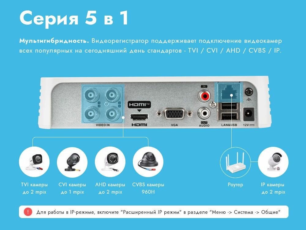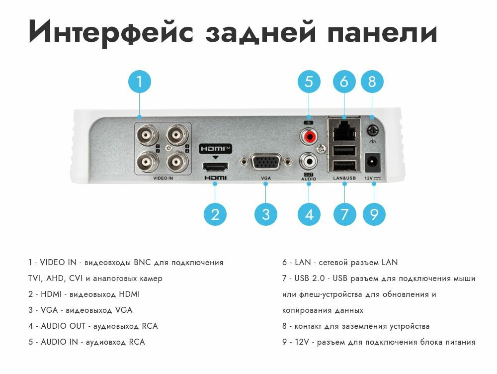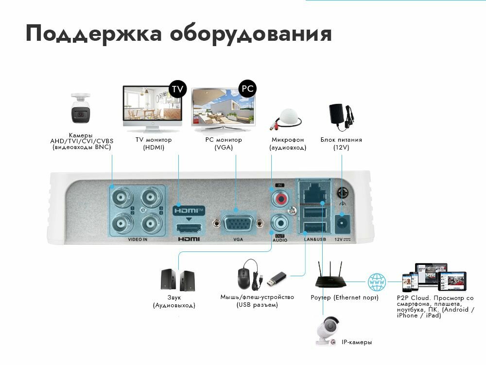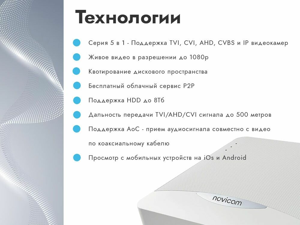 | Дополнительная информация | квотирование дискового пространства, живое видео в разрешении до 1080p, бесплатный облачный сервис Р2Р, дальность передачи TVI/AHD/CVI сигнала до 500 метров, поддержка AoC - прием аудиосигнала совместно с видео по коаксиальному кабелю, просмотр с мобильных устройств на iOs и Android |