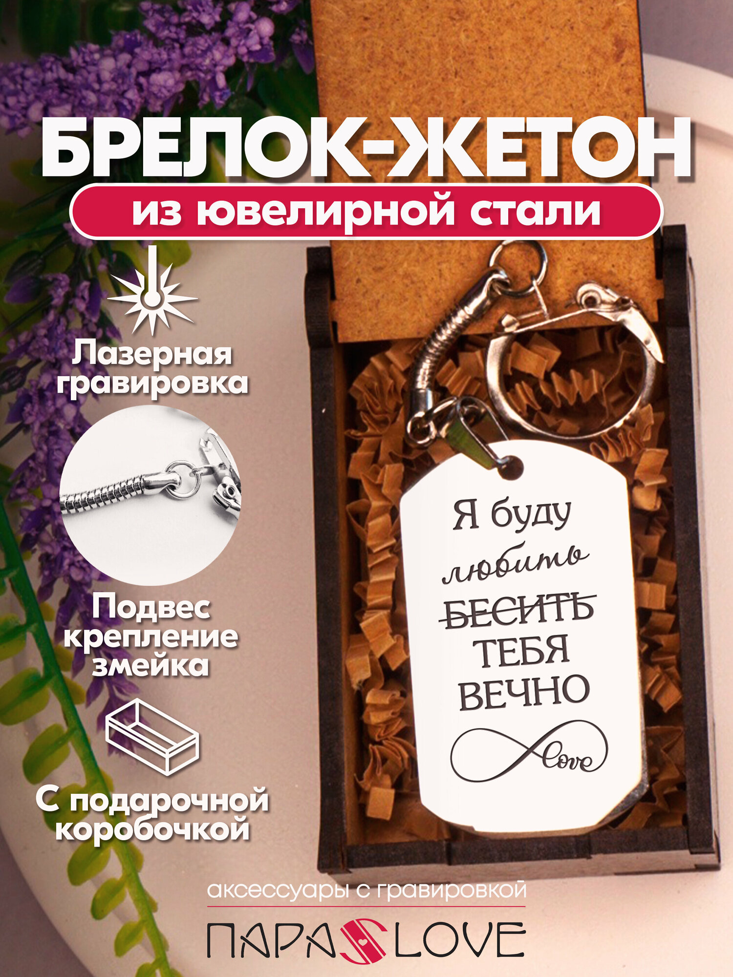 Брелок для ключей мужской "Я буду любить(бесить) тебя вечно" с лазерной гравировкой в подарочной коробке. Жетон на сумку, рюкзак, ключи авто и дома. интересное:
