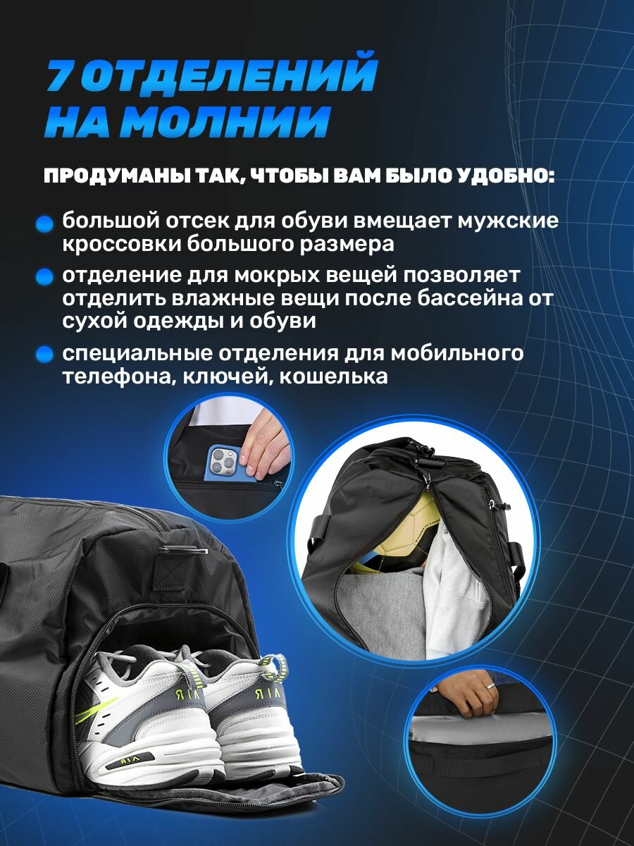 | Отделения | внешний карман, внутренний карман, карман для планшета, отделение для зонта, отделение для ключей, отделение для мокрых вещей, отделение для ноутбука, отделение для обуви, отделение для очков, отделение для телефона, фиксирующие ремни |