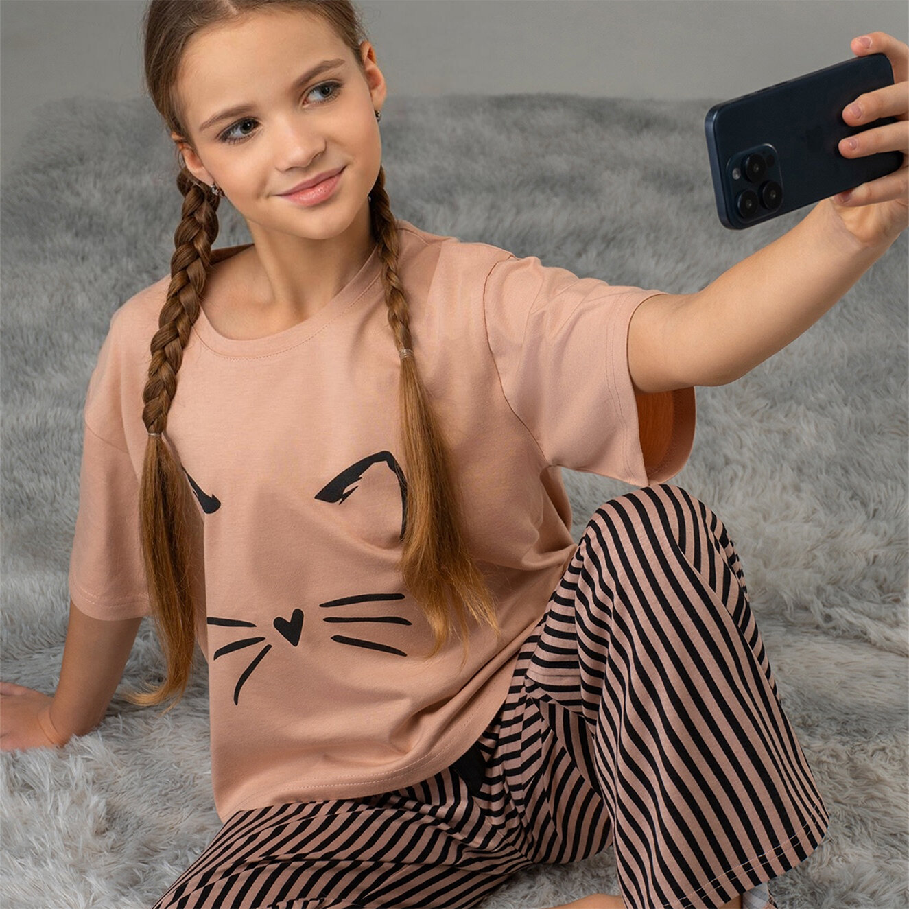 Пижама для девочки подростка со штанами хлопок HappyFox, HF8936SP размер 146, цвет усы.и.уши.бежевый