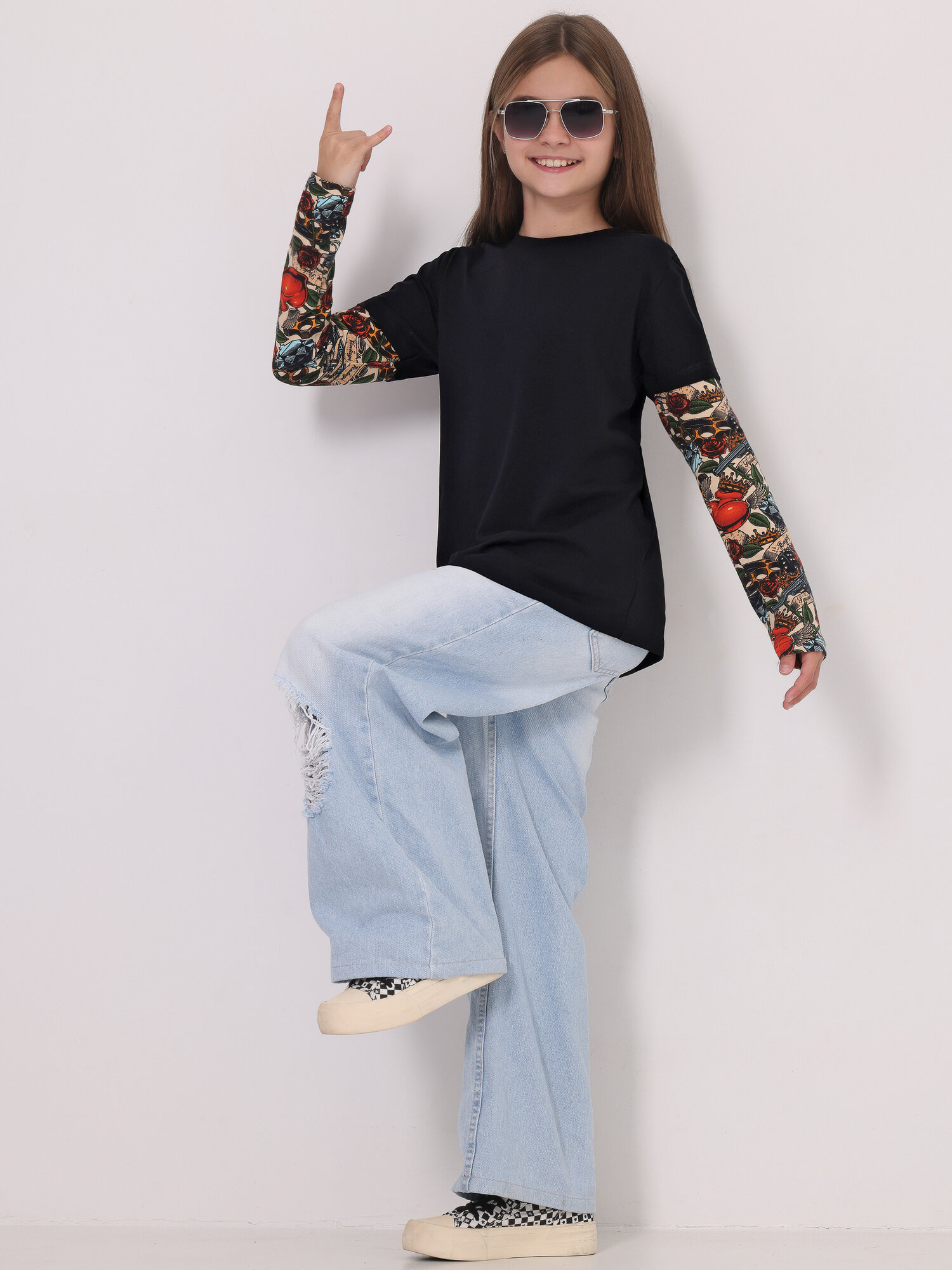 Лонгслив с тату-рукавами для девочки Апрель 1ДДЛД4025804н/1436/*/4930/*/*/*/* черный 64-128