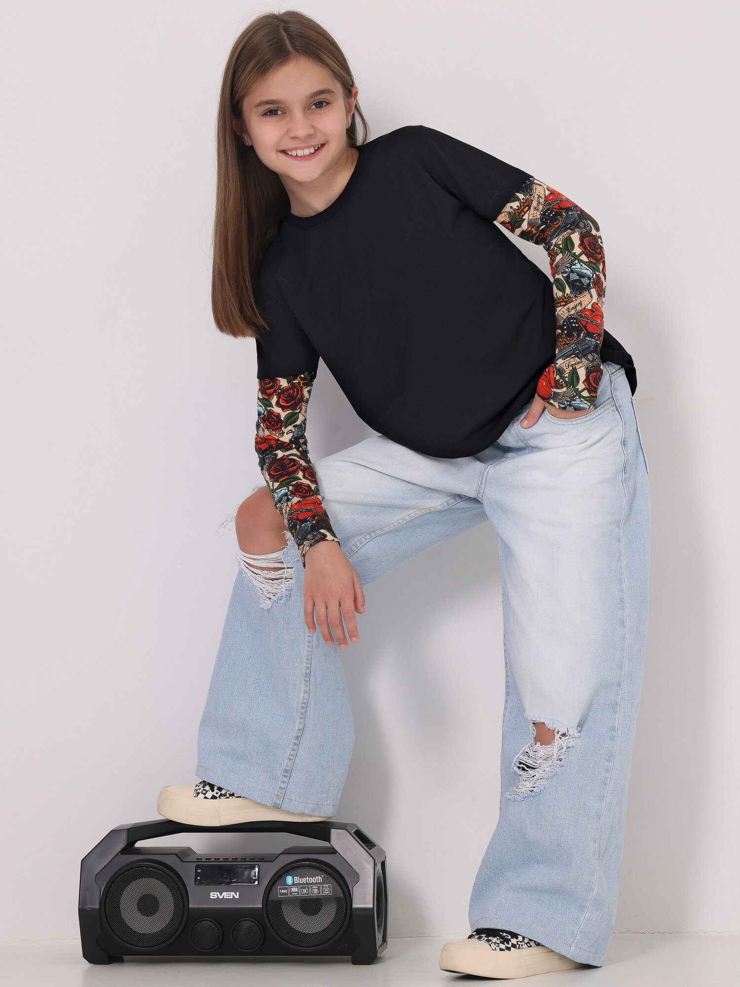 Купить Лонгслив с тату-рукавами для девочки Апрель 1ДДЛД4025804н/1436/*/4930/*/*/*/* черный 76-146