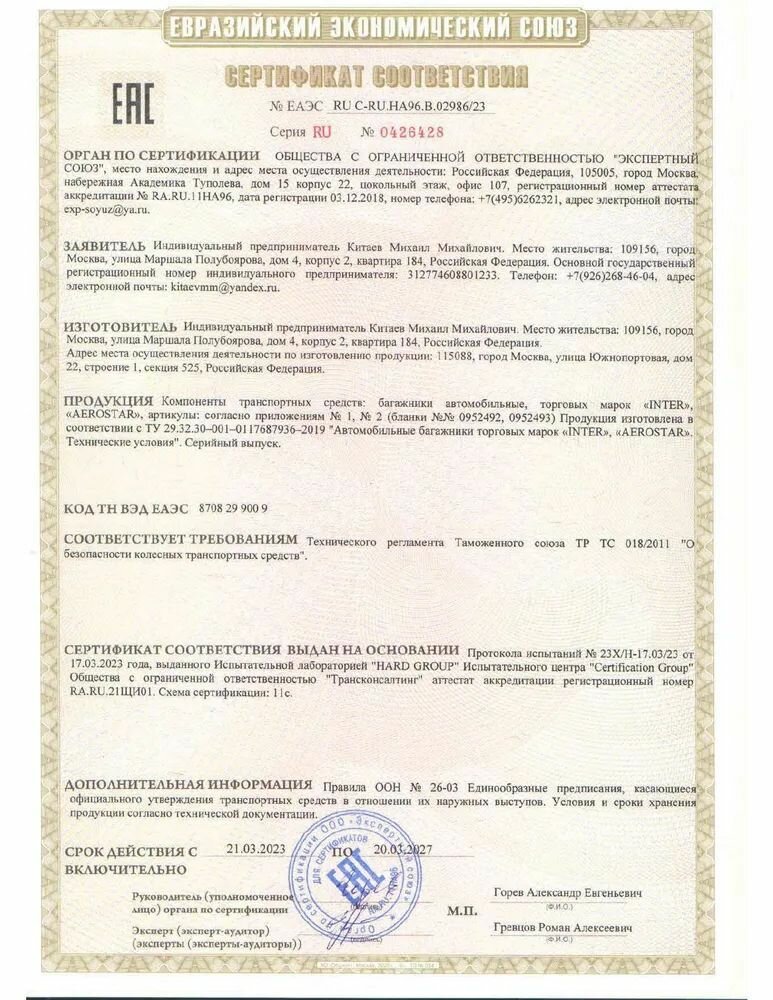 | Подробная комплектация | 4 адаптера для авто, шестигранник, 2 дуги, 4 заглушки для поперечин, инструкция |
