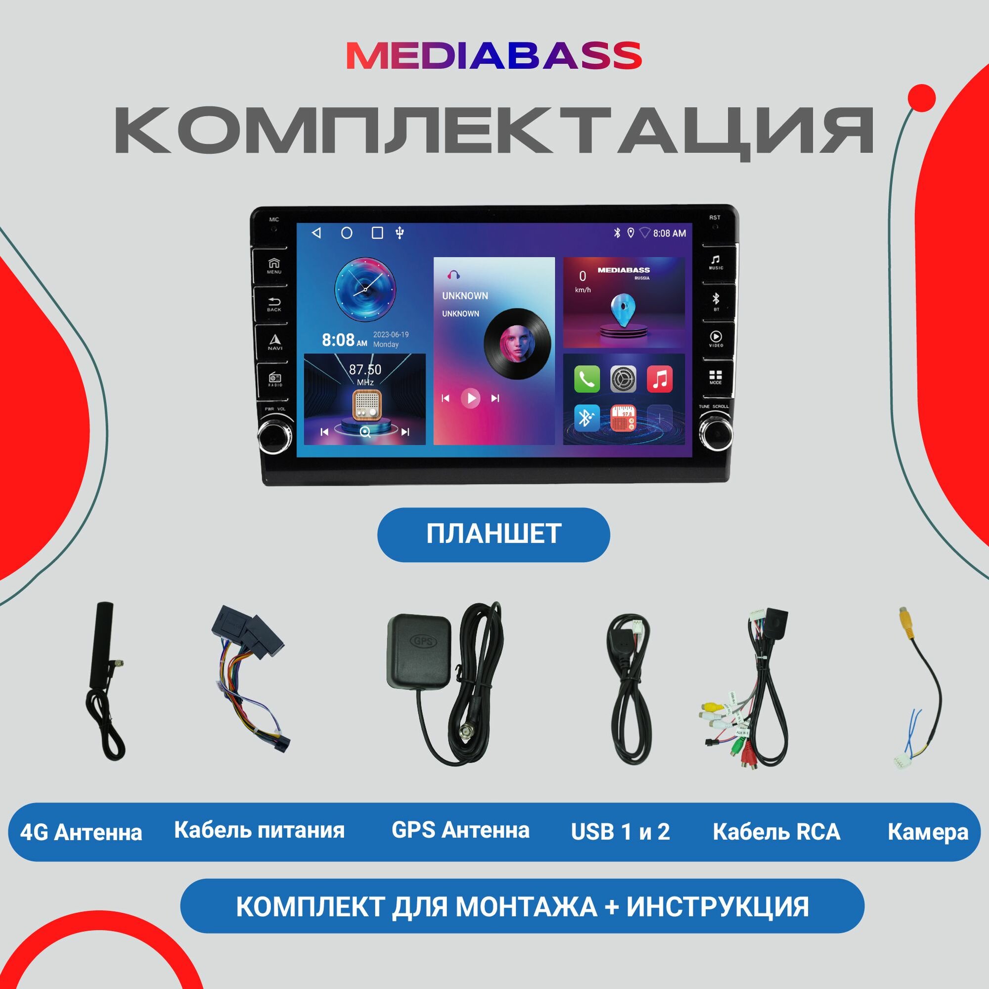 | Подробная комплектация | 1. Головное устройство 2. Переходная рамка 3. Комплект проводов для подключения 4. GPS антенна 5. 4G антенна 6. Камера заднего вида |