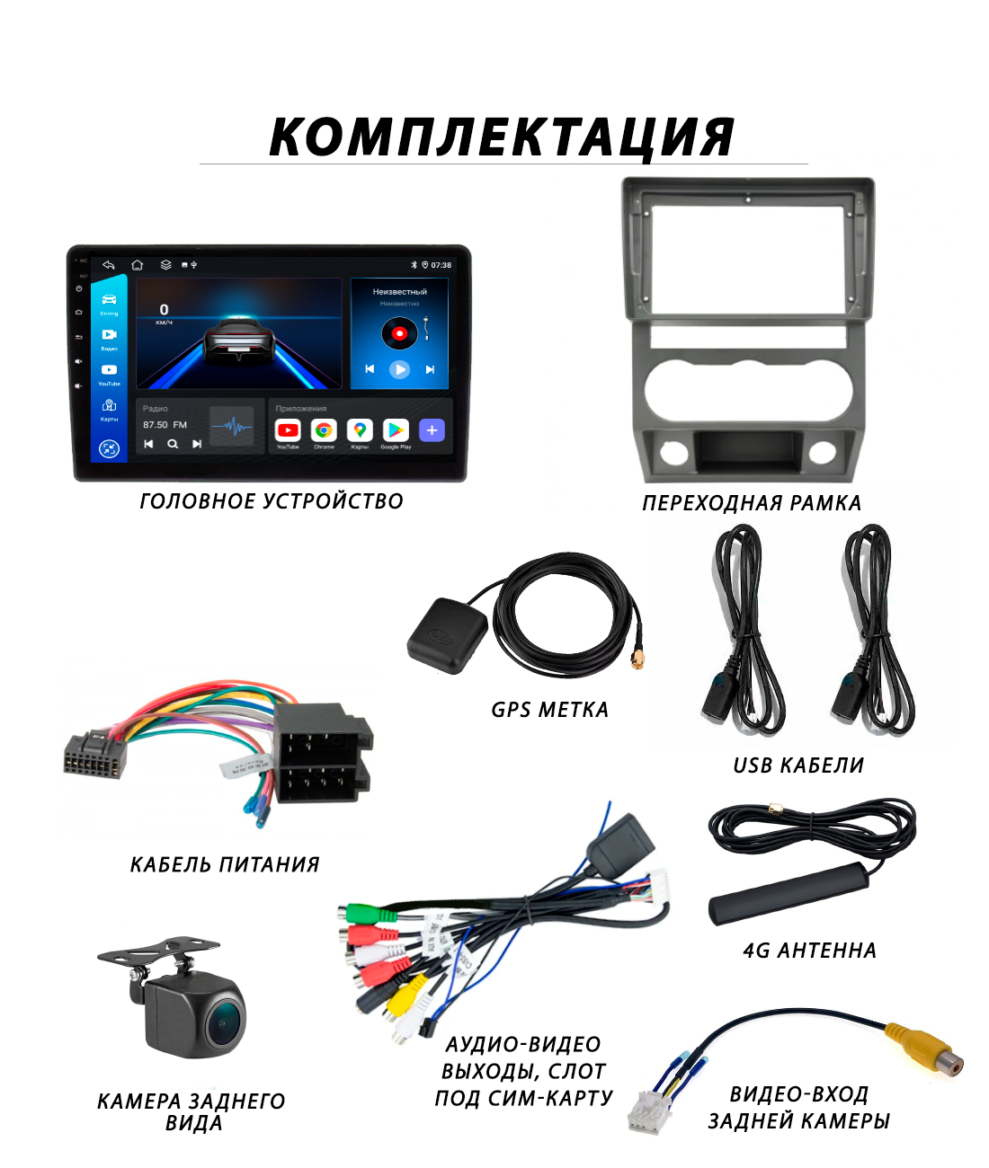 | Подробная комплектация | Головное устройство, переходная рамка 9 дюйм, кабель питания под авто, кабель usb - 2шт, gps-метка, антенна 4G, коса rca (аудио-видео выходы, слот под сим-карту), видео-вход камеры заднего вида, камера заднего вида (в подарок). |