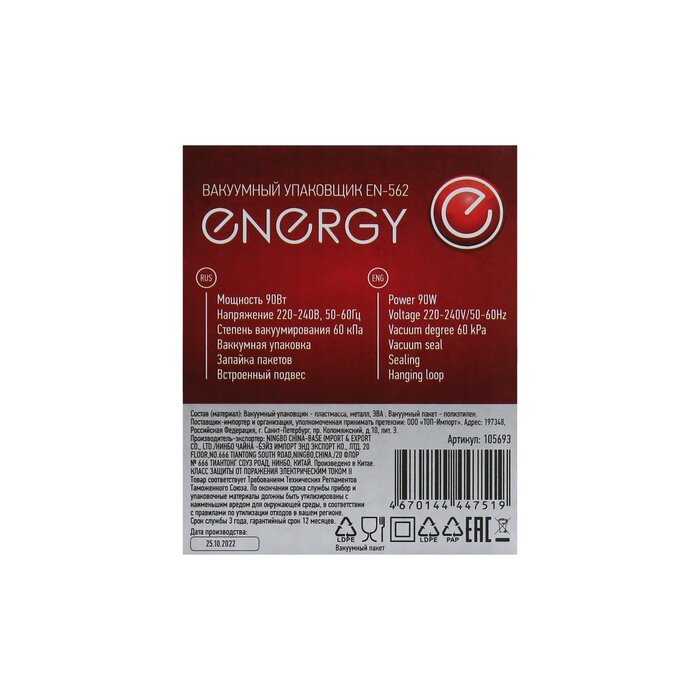Вакуумный упаковщик Energy EN-562 красный интересное: