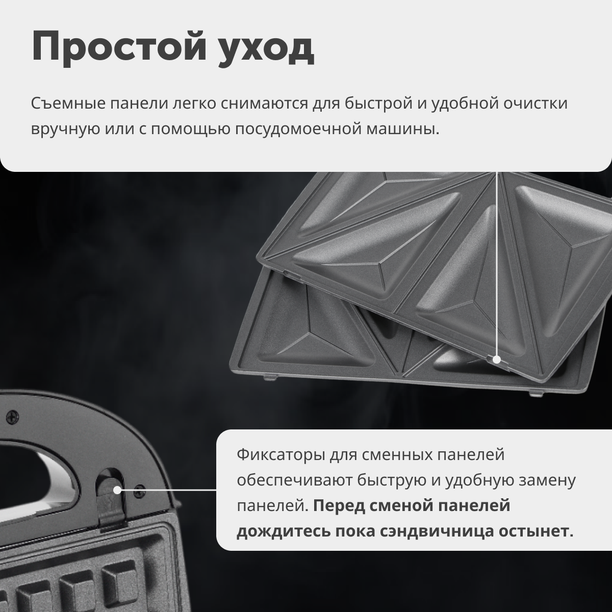| Особенности | антипригарное покрытие, возможность смены панелей, защита от перегрева, индикатор работы |