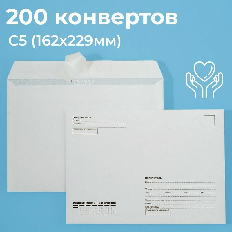 Купить Почтовые конверты бумажные С5 (162х229мм) 200 шт. отрывная лента, запечатка кому-куда для документов C5