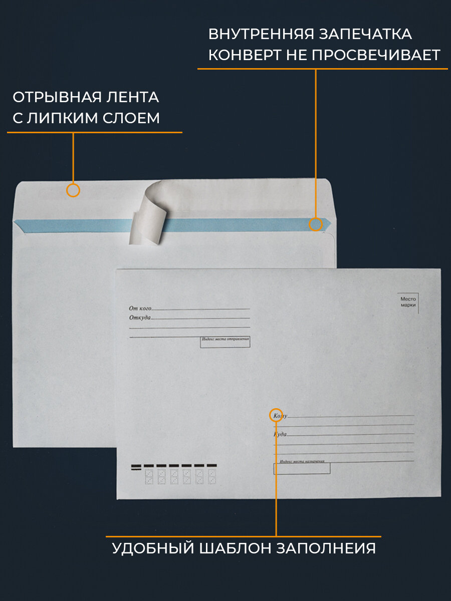 Почтовые конверты бумажные С5 (162х229мм) 50 шт. отрывная лента, запечатка, кому-куда для документов C5