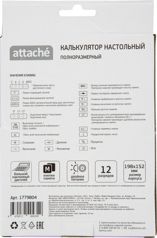 Ниже Вы можете прочитать отзывы на Калькулятор настольный полноразм Attache AF-447P,12р,дв.пит,фиол,198x153x42, ознакомится с подробными характеристиками, посмотреть интересные обзоры и фотографии на Калькулятор настольный полноразм Attache AF-447P,12р,дв.пит,фиол,198x153x42.
