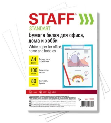 Бумага Staff белая, "Стандарт", А4, 80 г/м2, 100 листов, для офиса, дома и хобби, Россия, CIE 146% интересное: