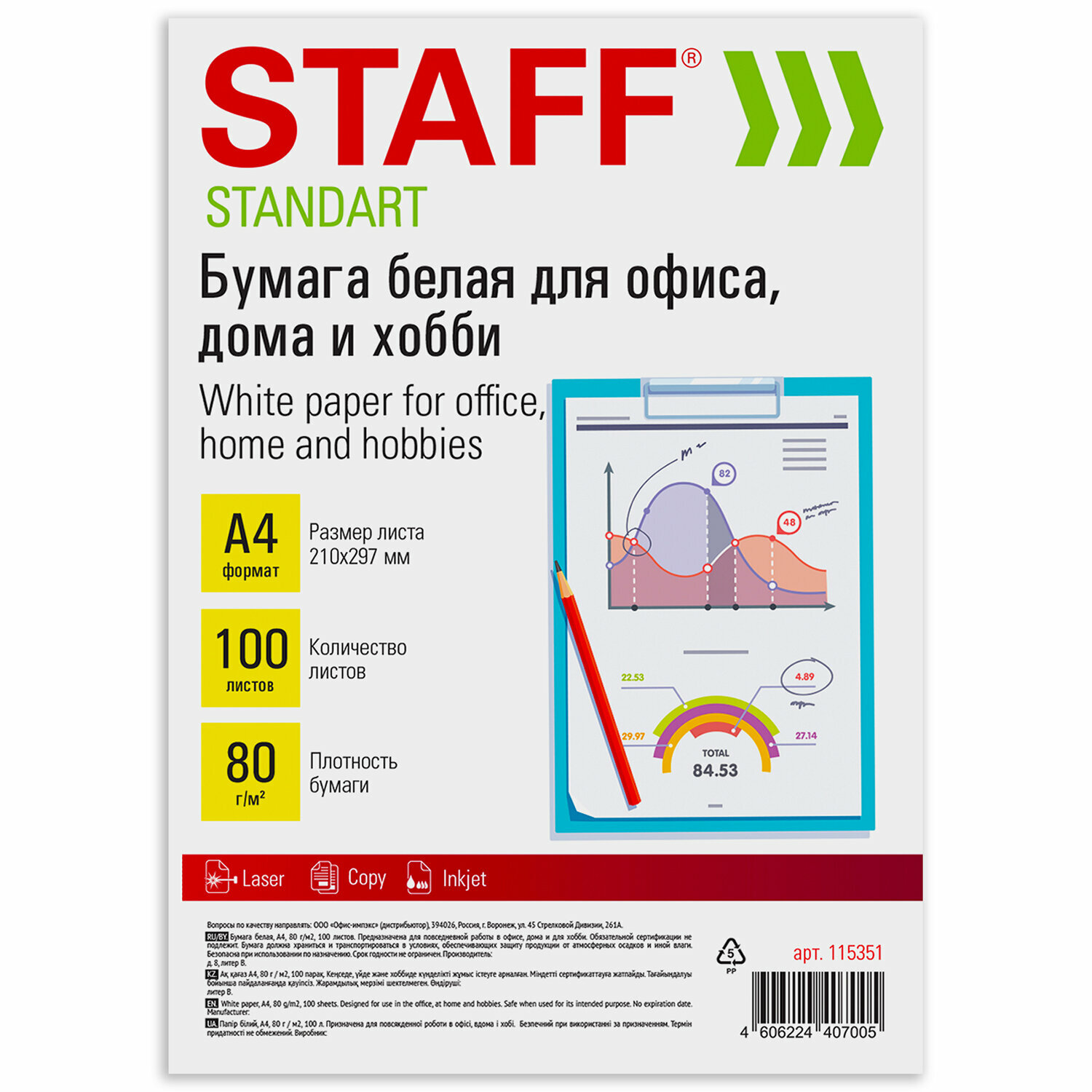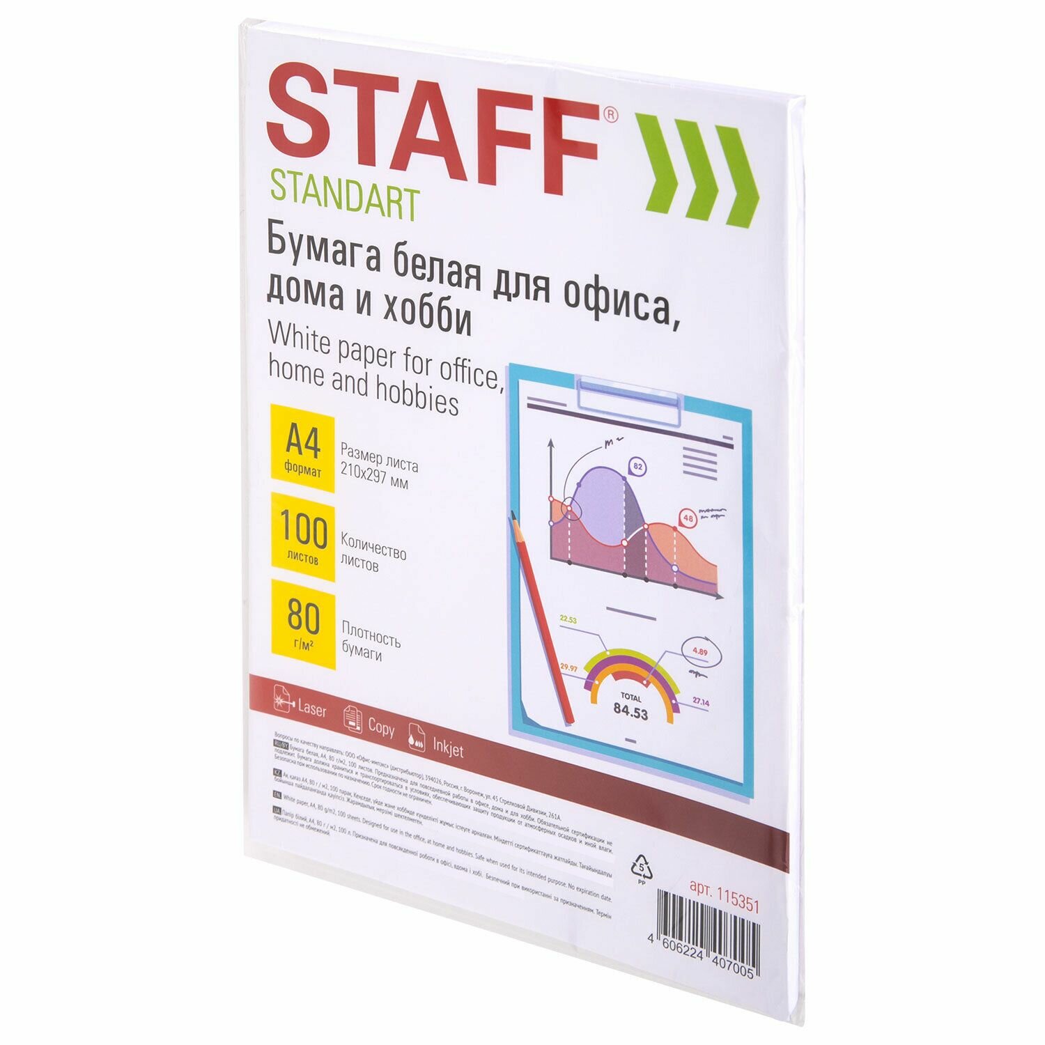 Бумага белая для принтера, 80 г/м2, 100 листов, Staff Стандарт для офиса, дома и хобби, Россия, 146% (CIE), 115351