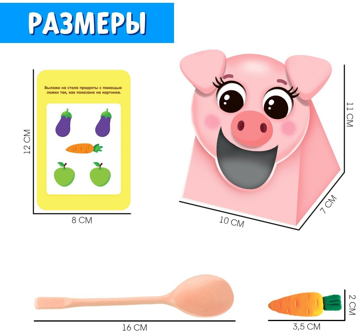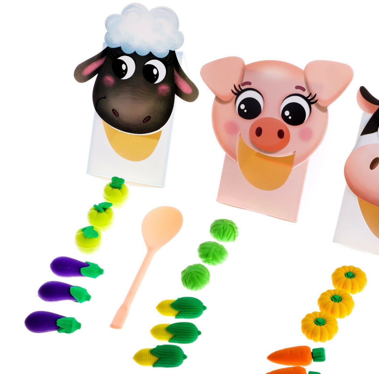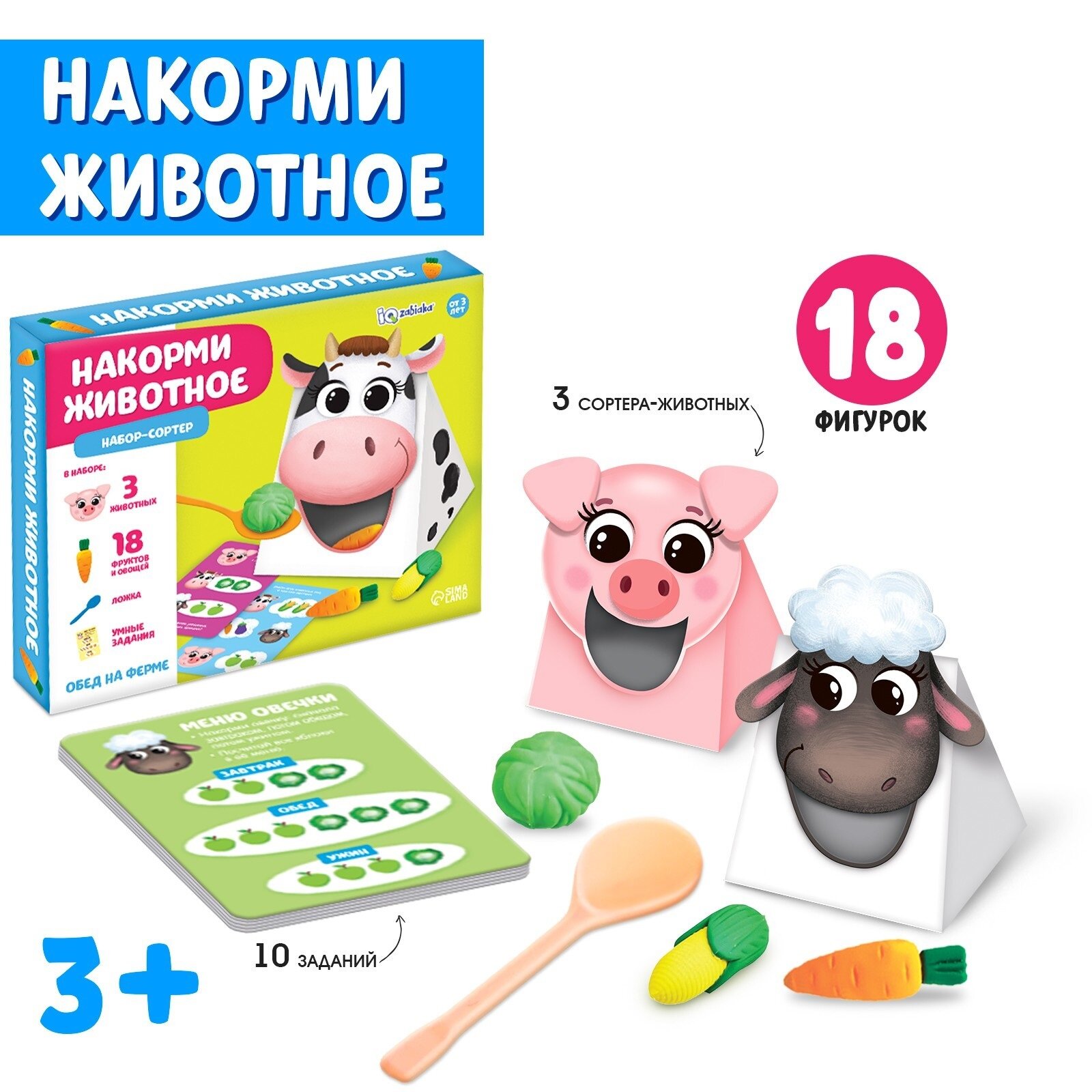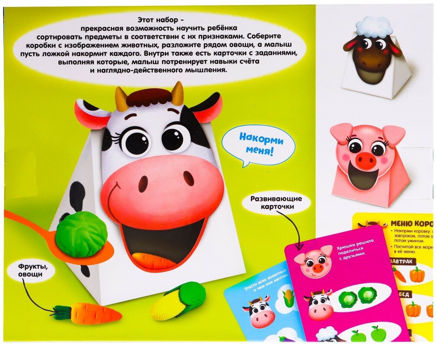 | Комплектация | 3 животных, 18 фруктов и овощей, ложка, задания |
