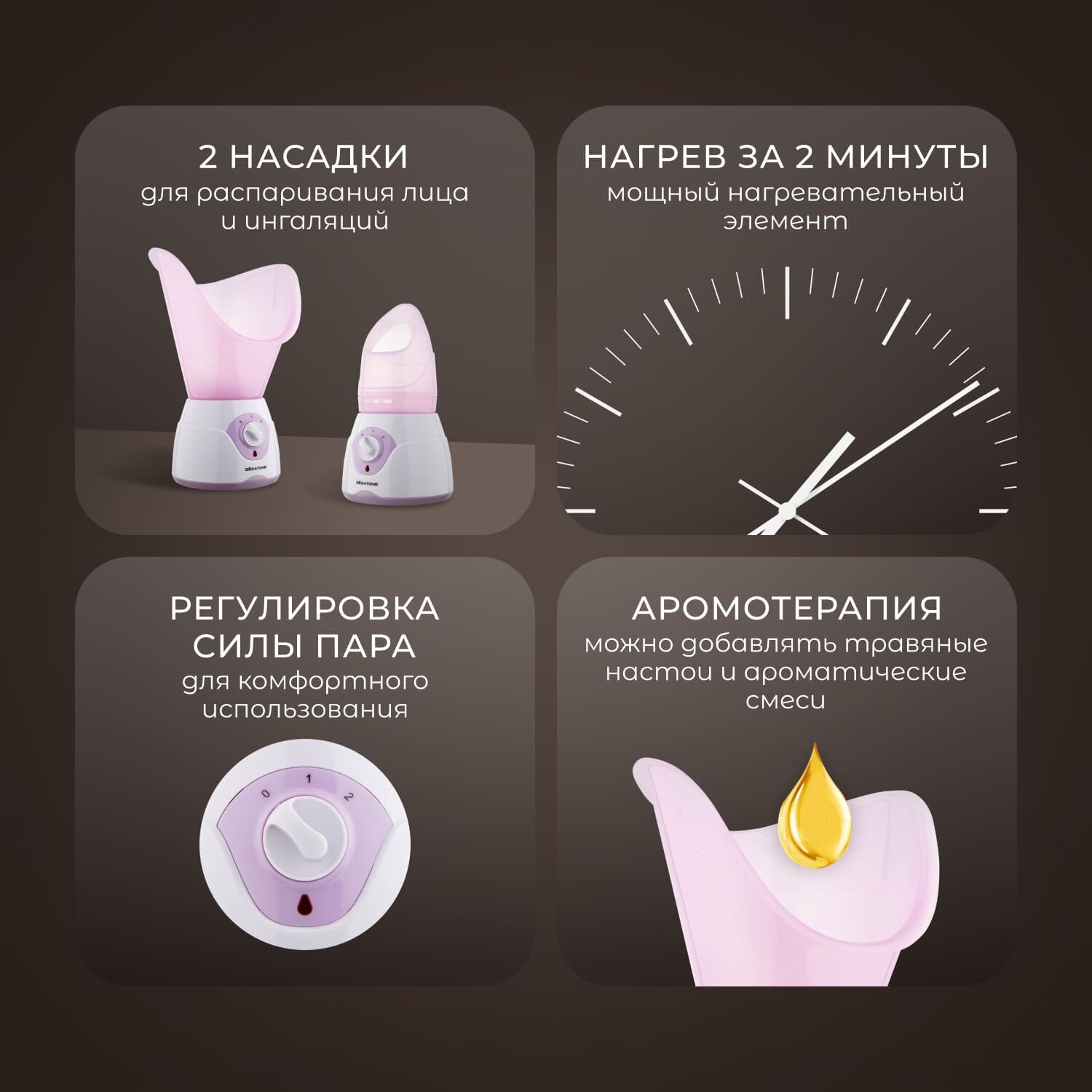 | Комплектность | центральный блок, прозрачная маска для лица, насадка для ингаляции, мерный стаканчик 50 мл, насадка для ароматерапии, инструкции по эксплуатации |