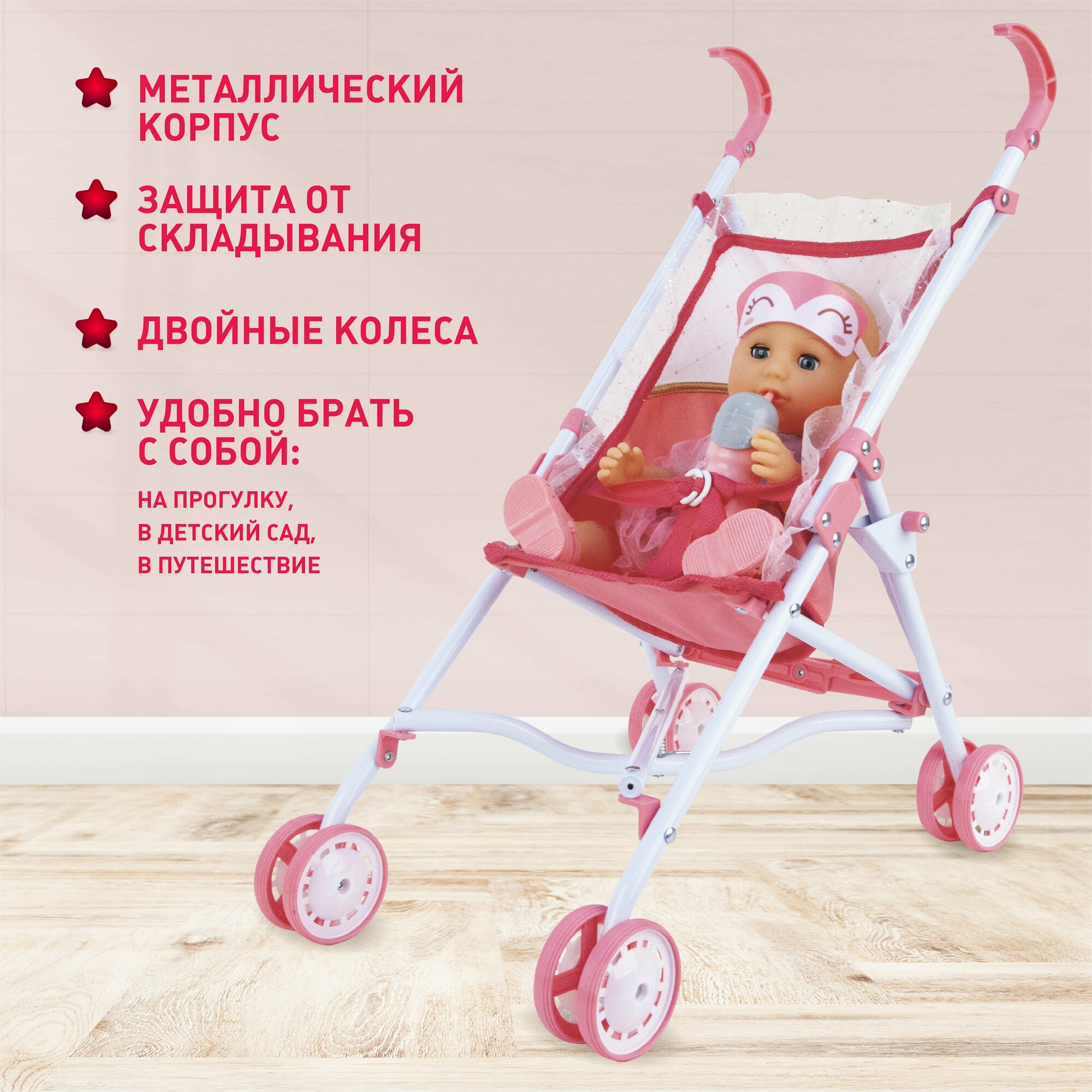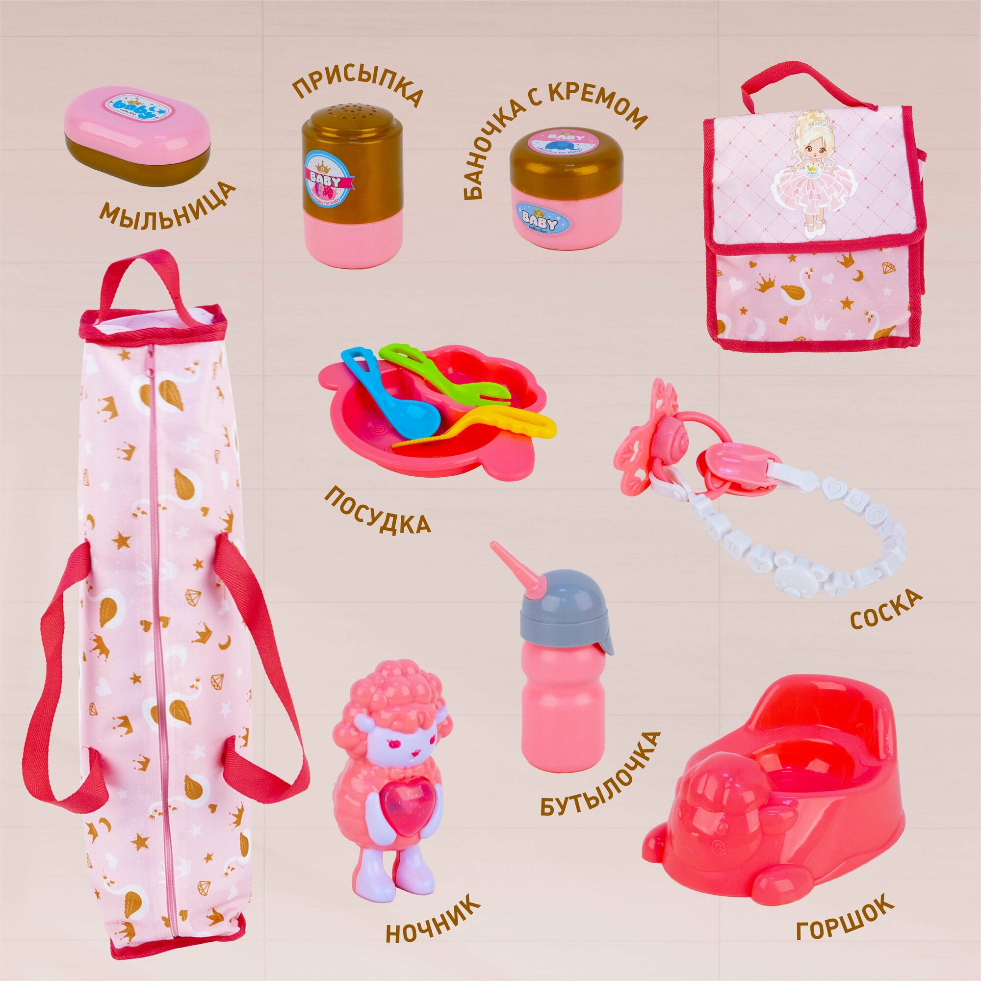 | Комплектация | кукла, кроватка-манеж, коляска-трость, детский коврик, музыкальный ночник со светом, соска, горшок, бутылочка, тарелочка, ложка и вилка для кормления, баночки «крем», «мыло», «присыпка», погремушка, пластиковый фартучек для кормления, две текстильные сумочки |