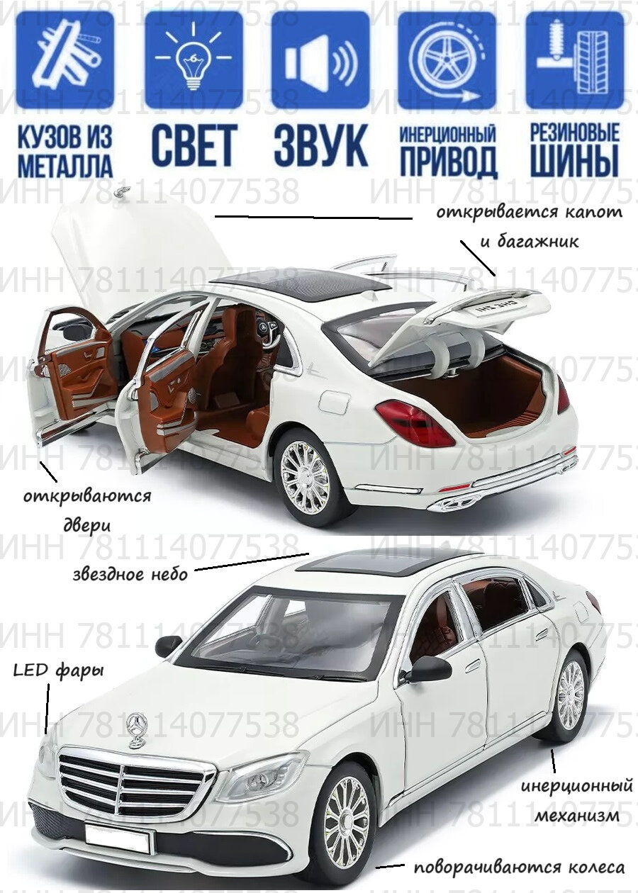 Машинка металл Мерседес Бенц E300, звездное небо, открываются двери, капот, багажник, поворачиваются колеса, со световыми и звуковыми эффектами, белая интересное: