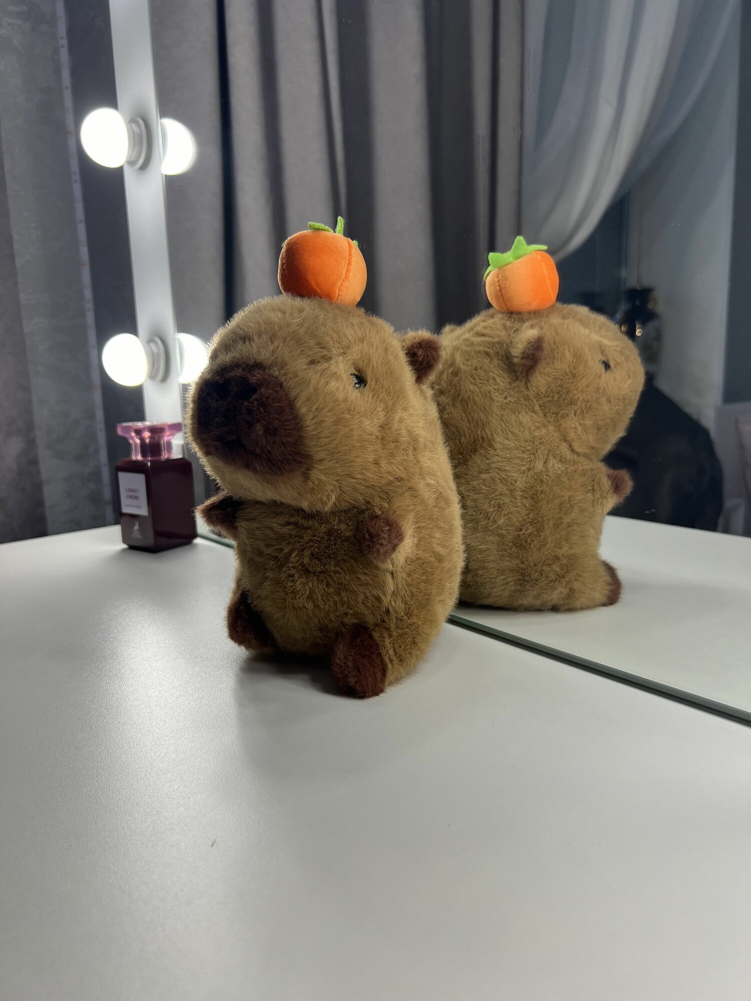 Мягкая игрушка Капибара с мандарином на голове интересное: