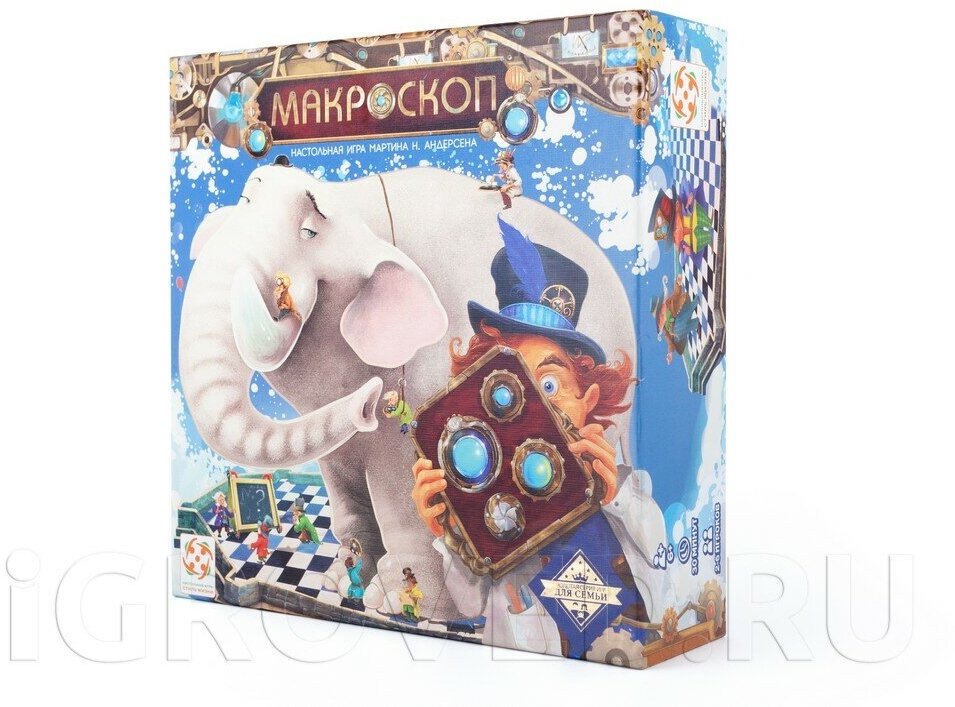 | Комплектация | В состав настольной игры входят: макроскоп из картонных элементов, 64 кристалла (10 синих и 54 жёлтых), 12 жетонов для окуляров, 200 двусторонних карточек с картинками и карта-заглушка, 2 шестигранных кубика, маркер подсчёта очков, счётчик раундов, правила игры. |