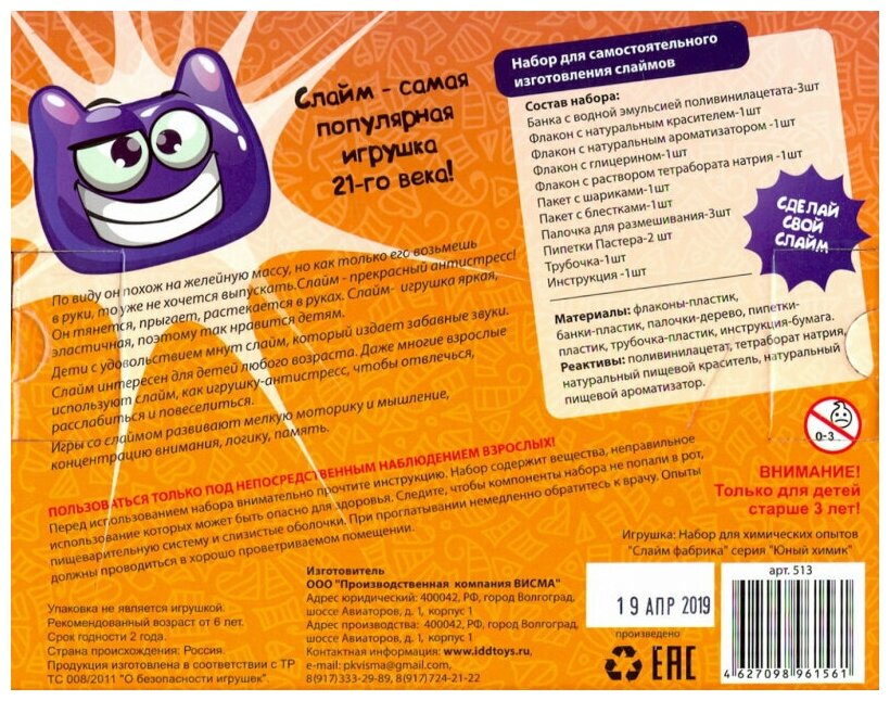 | Комплектация | баночка с водной эмульсией поливинилацетата, натуральный краситель, натуральный ароматизатор, глицерин, тетраборат натрия, шарики, блёстки, пипетка Пастера для удобства добавления ингредиентов, трубочка для выдувания, инструкция |