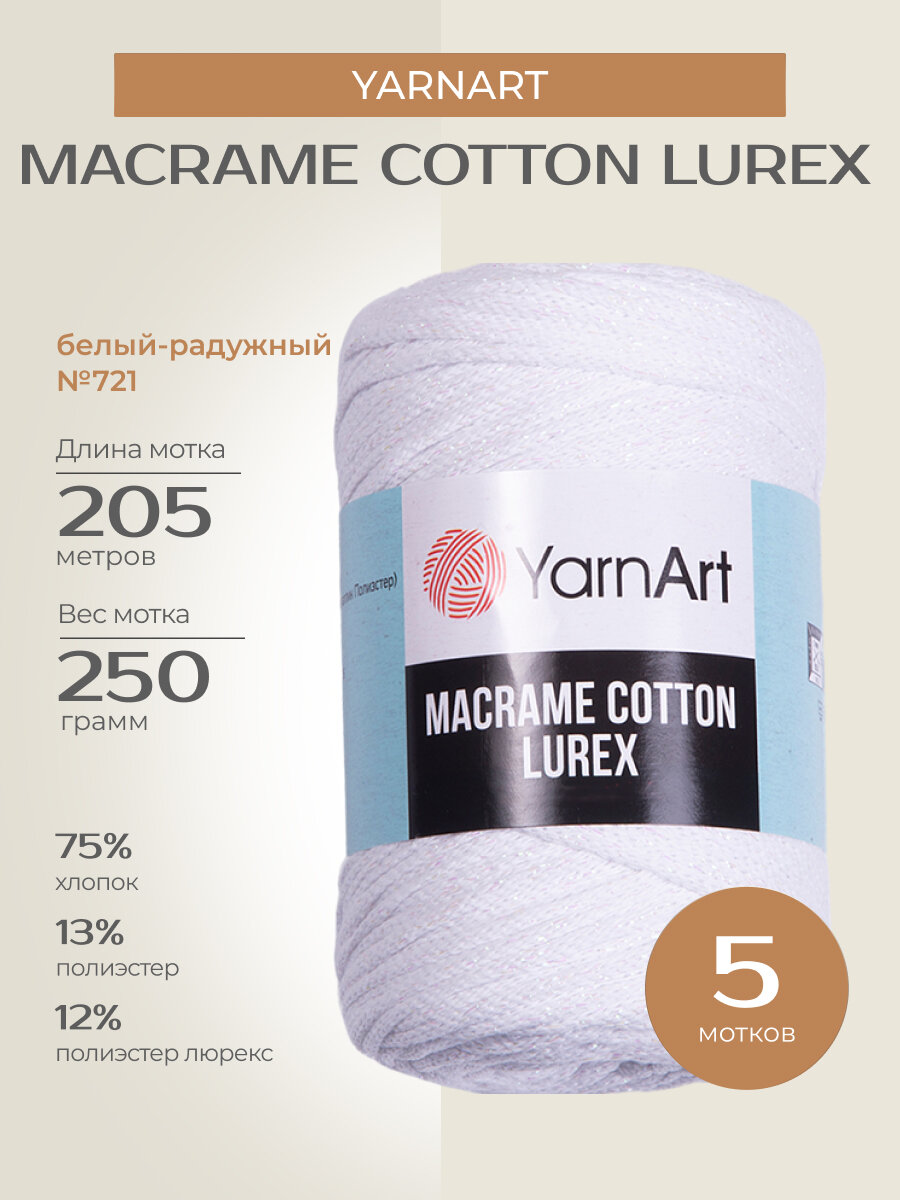 СохранитьПряжа для вязания спицами, крючком YarnArt "Macrame Cotton Lurex" фантазийная средняя, хлопок, полиэстер люрекс, цвет: 721 Белый-радужный, 5шт., 205 м интересное:
